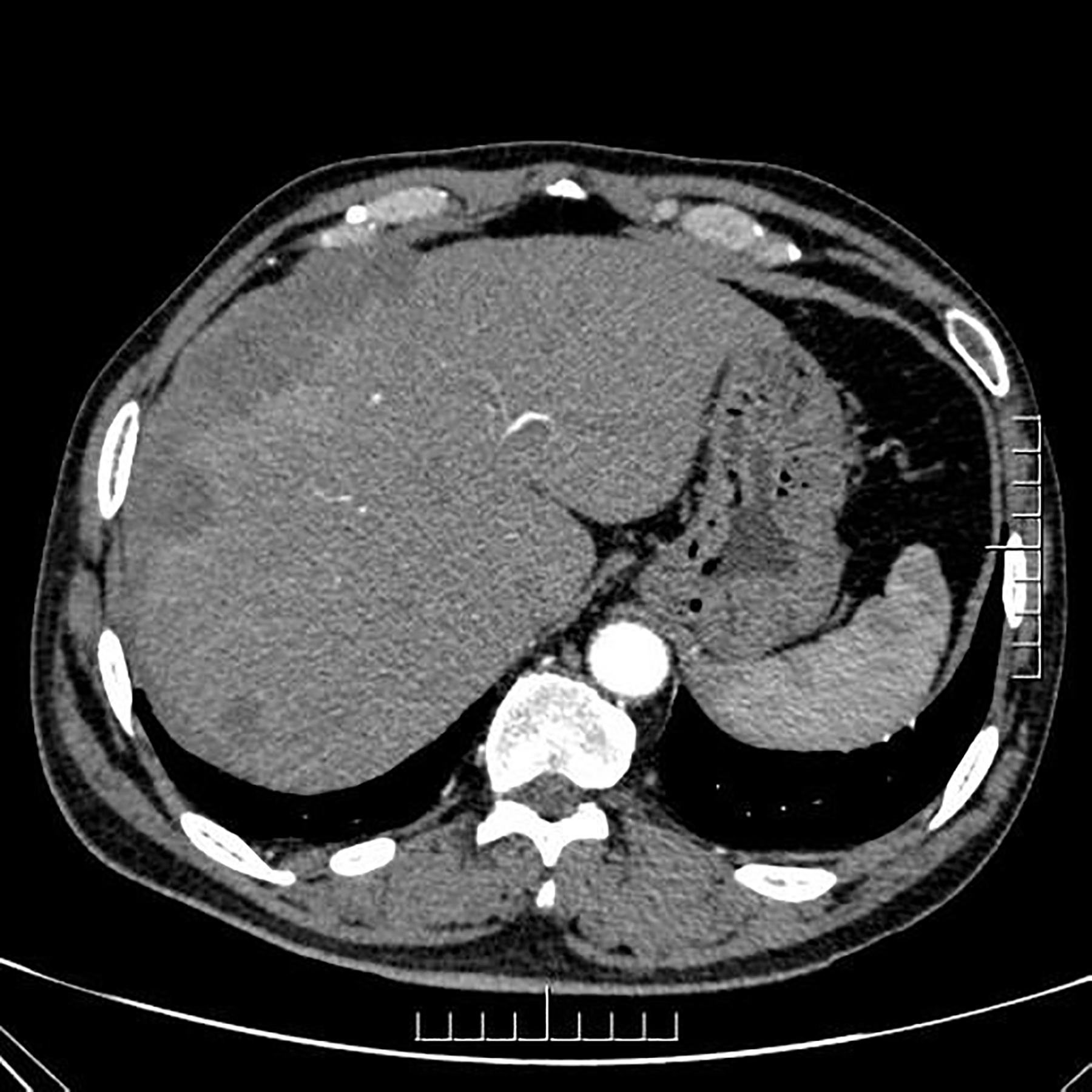 Axial contrast-enhanced CT image of the abdomen during the late arterial phase showing multiple nodular and sheet-like low-attenuation lesions with peripheral enhancement in the right subdiaphragm and right anterior and left medial lobe of the liver.
