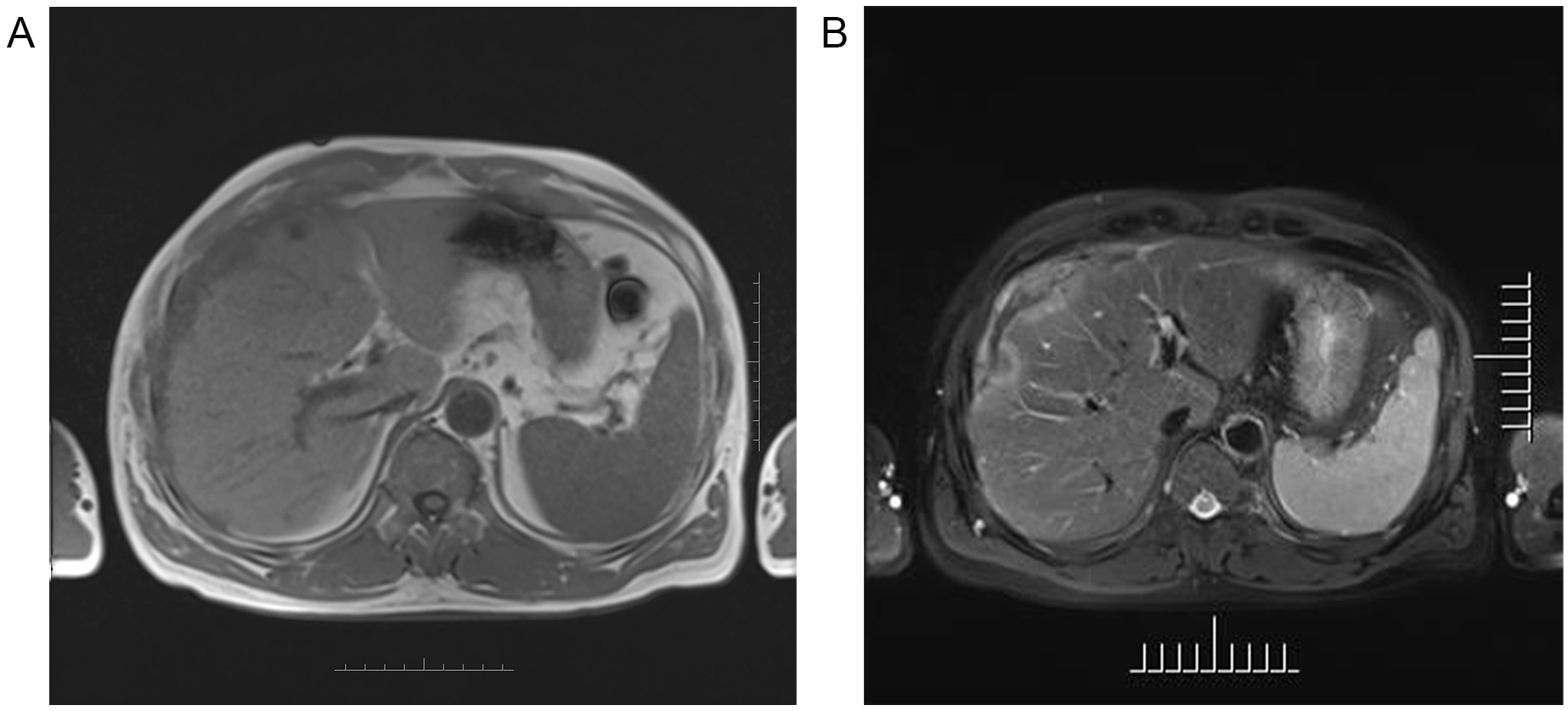 Axial MR images of the upper abdomen showing the lesion in the right subdiaphragm and right anterior and left medial lobe of the liver demonstrated intermediate-to-low intensity on T1-weighted images (A), and central intermediate-to-low intensity and peripherally intermediate-to-high signal on T2-weighted image (B).