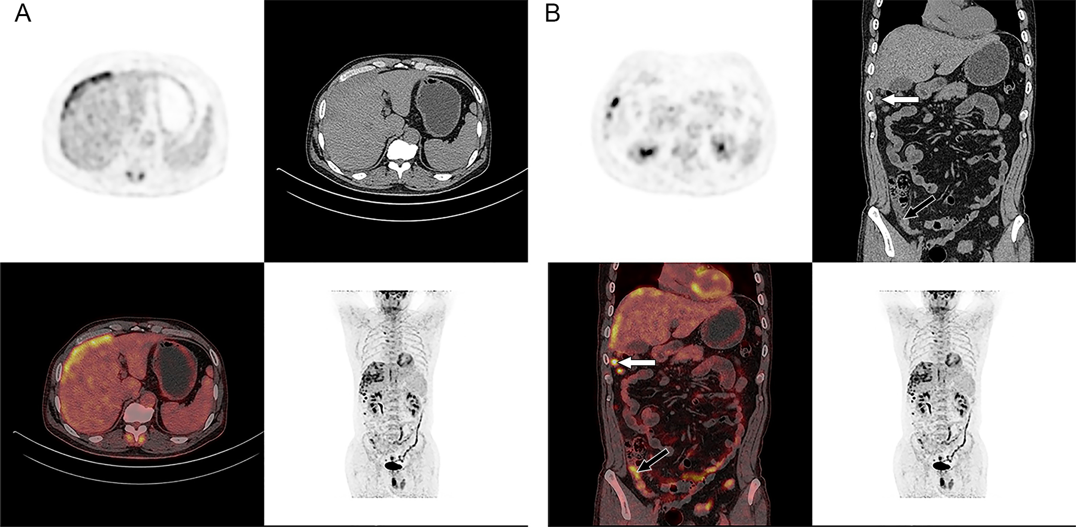 18F-FDG PET/CT images of the whole body. Axial PET/CT images of the abdomen showed abnormally elevated FDG activity in the multiple ill-defined low-attenuation lesions of the right subdiaphragm and right anterior and left medial lobe of the liver (SUVmax of 11.2 and SUVmax of 12.6 in late phase) (A). Coronal PET/CT images of the whole body showed abnormal uptake in the right peritoneum with irregular nodular thickness (black arrow) (SUVmax of 7.7 and SUVmax of 9.3 in late phase) and multiple high activity nodules in the right abdominal cavity (white arrow) (the largest one is SUVmax of 11.9 and SUVmax of 11.6 in late phase) (B).