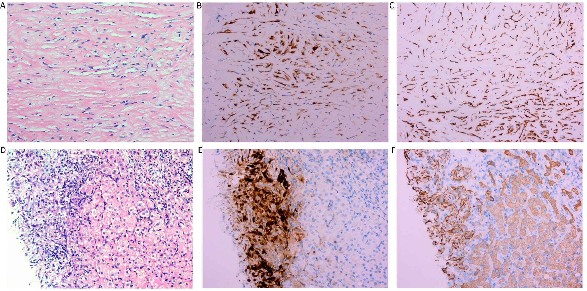 Histological findings of the right subdiaphragmatic lesion. Hematoxylin-eosin (HE) staining (x 200) reveals dense fibrocollagenous tissue infiltrated by spindle-shaped cells (A). and immunohistochemistry revealed immunopositivity for CR and CK (B, C), suggestive of desmoplastic malignant mesothelioma of peritoneum. Histological findings of the lesions of the liver. Hematoxylin-eosin (HE) staining (x 200) reveals dense fibrocollagenous tissue infiltrated by spindle-shaped cells (D) and immunohistochemistry showing immunopositivity for CR and CK (E, F), which is indicative of desmoplastic malignant mesothelioma of the peritoneum directedly invading the liver.