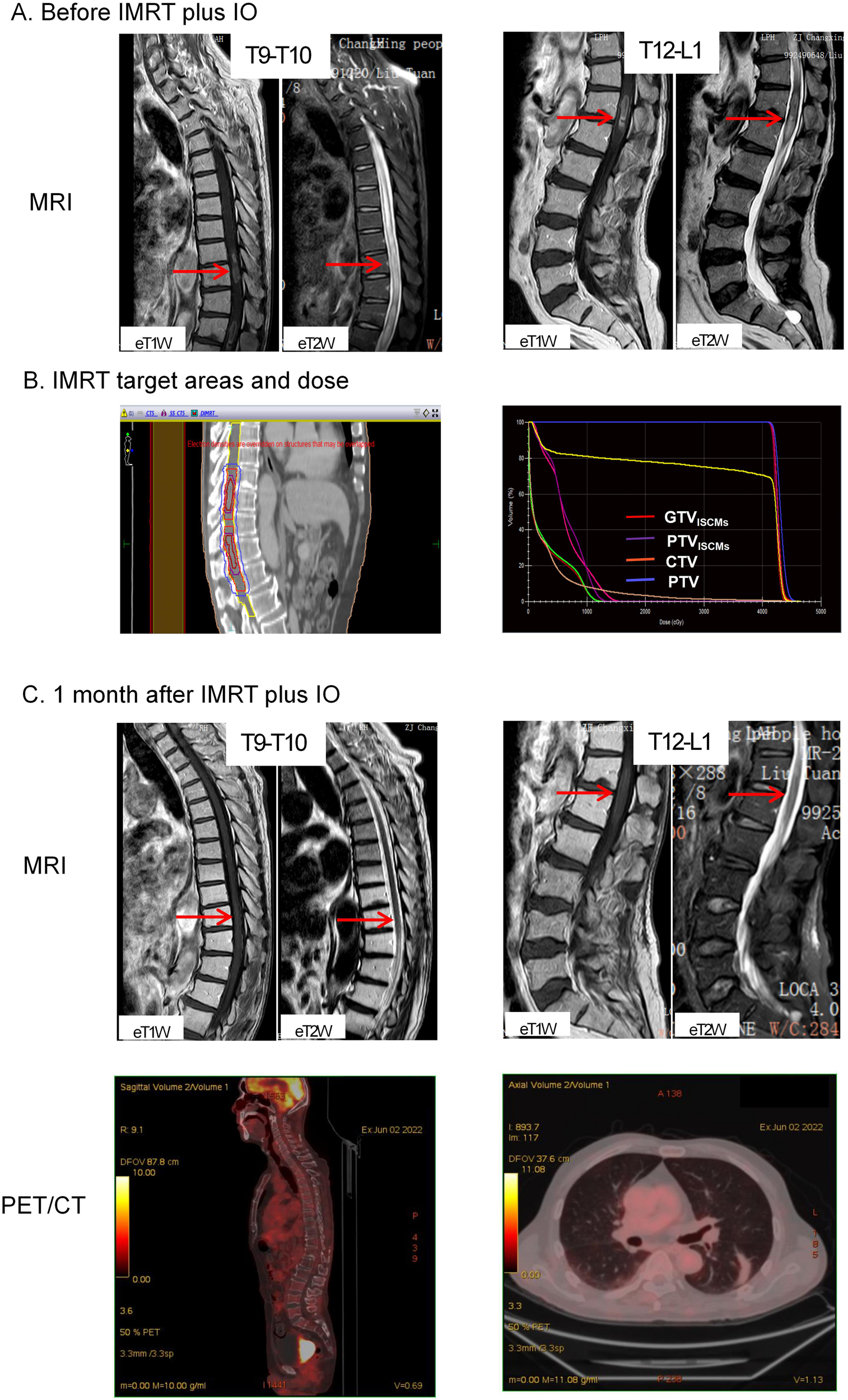 Imaging of tumor lesions before and after treatment. (A) MRI before IMRT plus IO showed that the signal of the spinal cord was not homogeneous, with foci of enhancement (indicated by red arrows) in the spinal cord at the T9-T10 and T12-L1 levels. (B) IMRT target areas in the median sagittal section (left) and total volume DVH (right). The bright red line is GTVISCMs, the purple line is PTVISCMs, the orange line is CTV and the blue line is PTV. The 100% radiation volume of GTVISCMs, PTVISCMs, CTV and PTV reached the dose of 40Gy, and the 95% radiation volume of PTV reached the dose of 42Gy. (C) MRI after IMRT plus IO treatment showed that the enhancement signal of the original lesions at T9-10 and T12-L1 levels decreased as an oedema signal (indicated by red arrows). In addition, PET/CT showed no abnormal FDG uptake throughout the spinal cord, mediastinum and both lungs. IMRT, intensity-modulated radiotherapy; IO, immunotherapy; MRI, magnetic resonance imaging; PET/CT, positron emission tomography/computed tomography; FDG, 18F-fluorodeoxyglucose. ISCMs, intramedullary spinal cord metastases; DVH, dose-volume histogram; GTVISCMs, gross tumor volume of ISCMs; PTVISCMs, planning target volume of ISCMs; CTV, clinical target volume; PTV, planning target volume.
