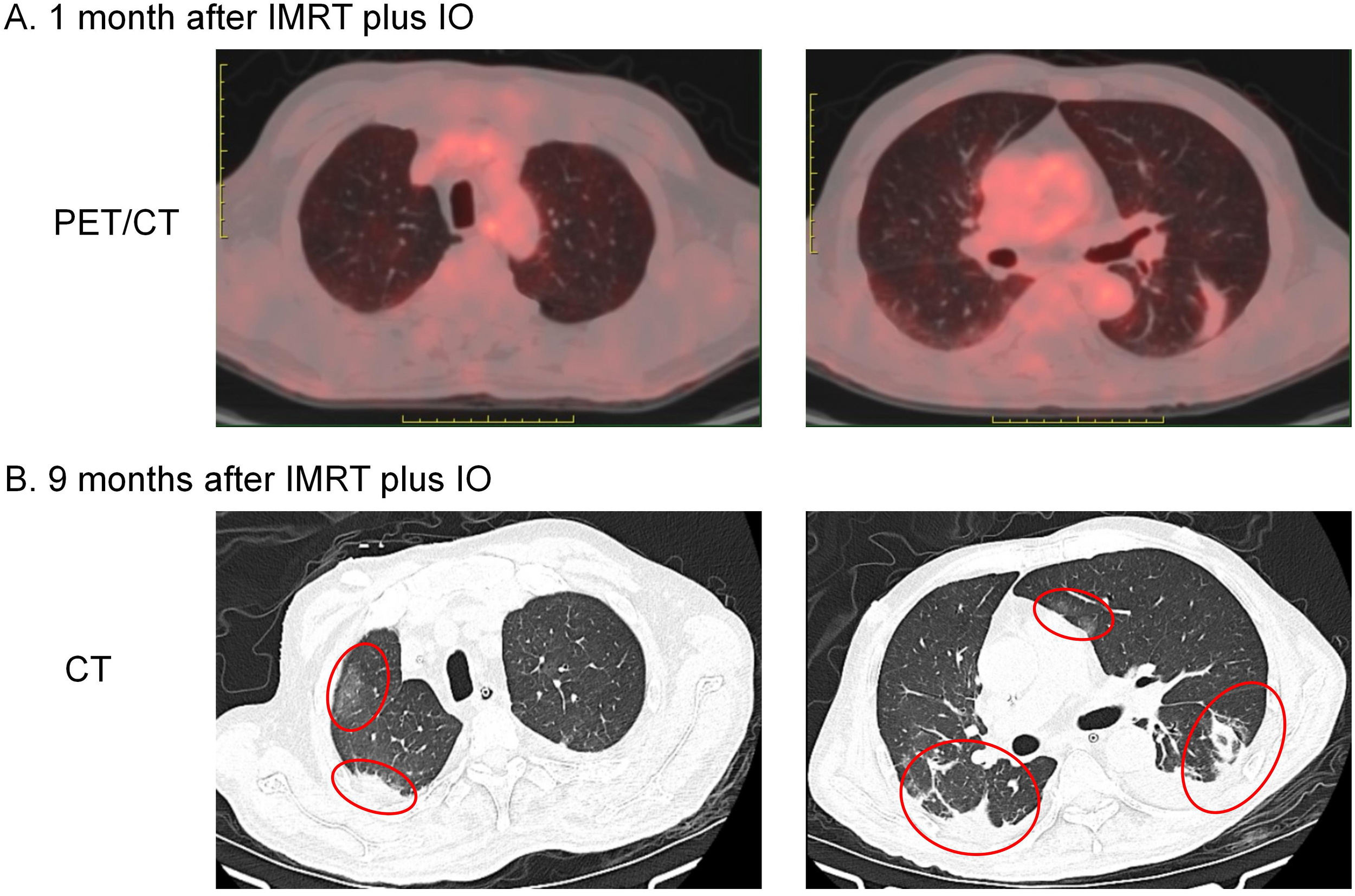Imaging changes in bilateral lung lesions. (A) PET/CT performed 1 month after IMRT plus IO showed striated lesions without abnormal FDG uptake in the lower lobe of the left lung only. (B) Chest CT performed 9 months after IMRT plus IO showed bilateral pleural effusions with emerging lamellar exudative, semisolid multiple foci underpinned by old interstitial lung changes (indicated by red circles).