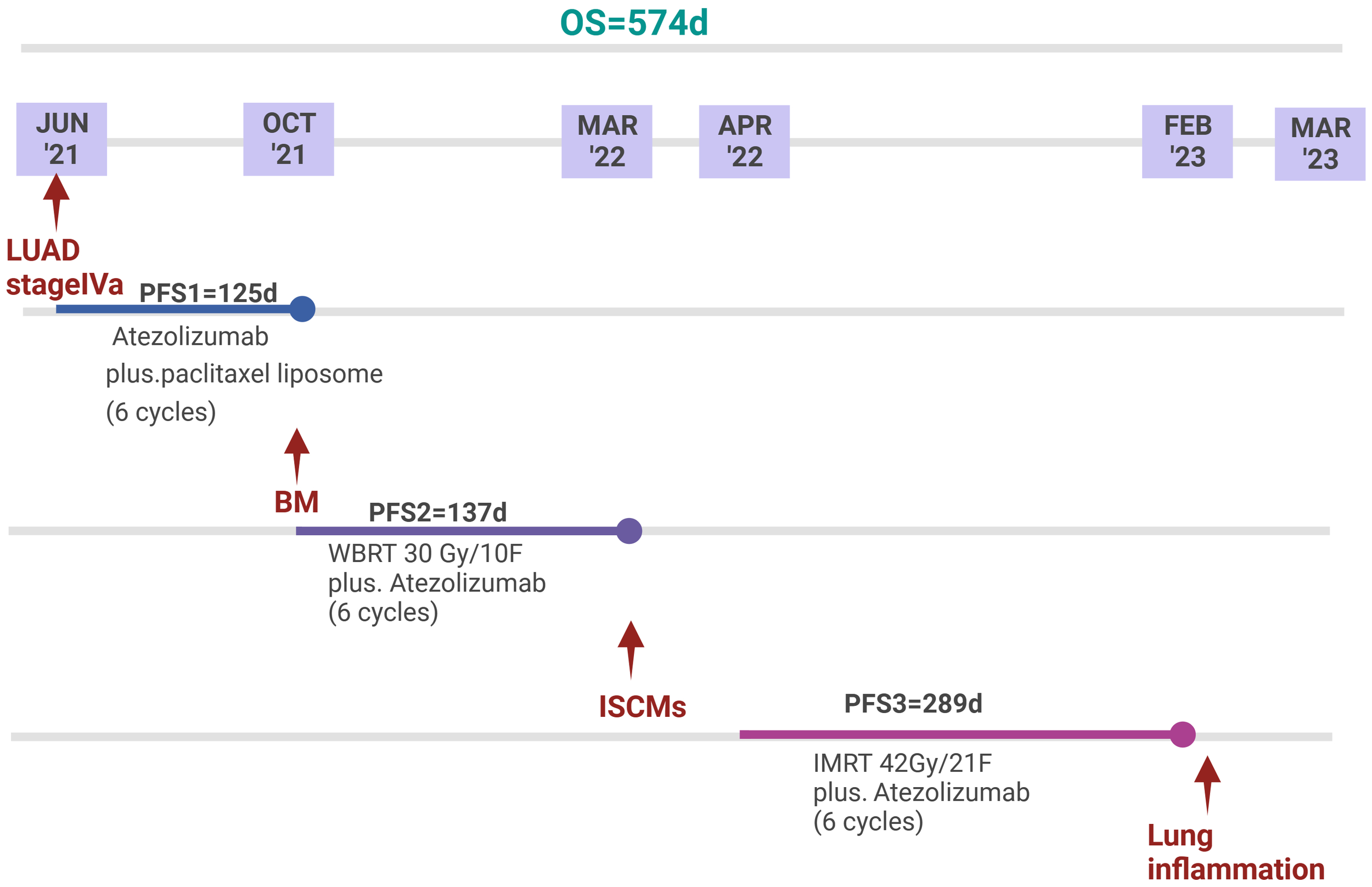 Timeline of anti-tumour treatment. Since the diagnosis of LUAD stage IVa, the patient achieved an overall survival of 574 days. Since the diagnosis of ISCMs, the patient achieved a PFS of 289 days. The patient eventually died of pneumonia.