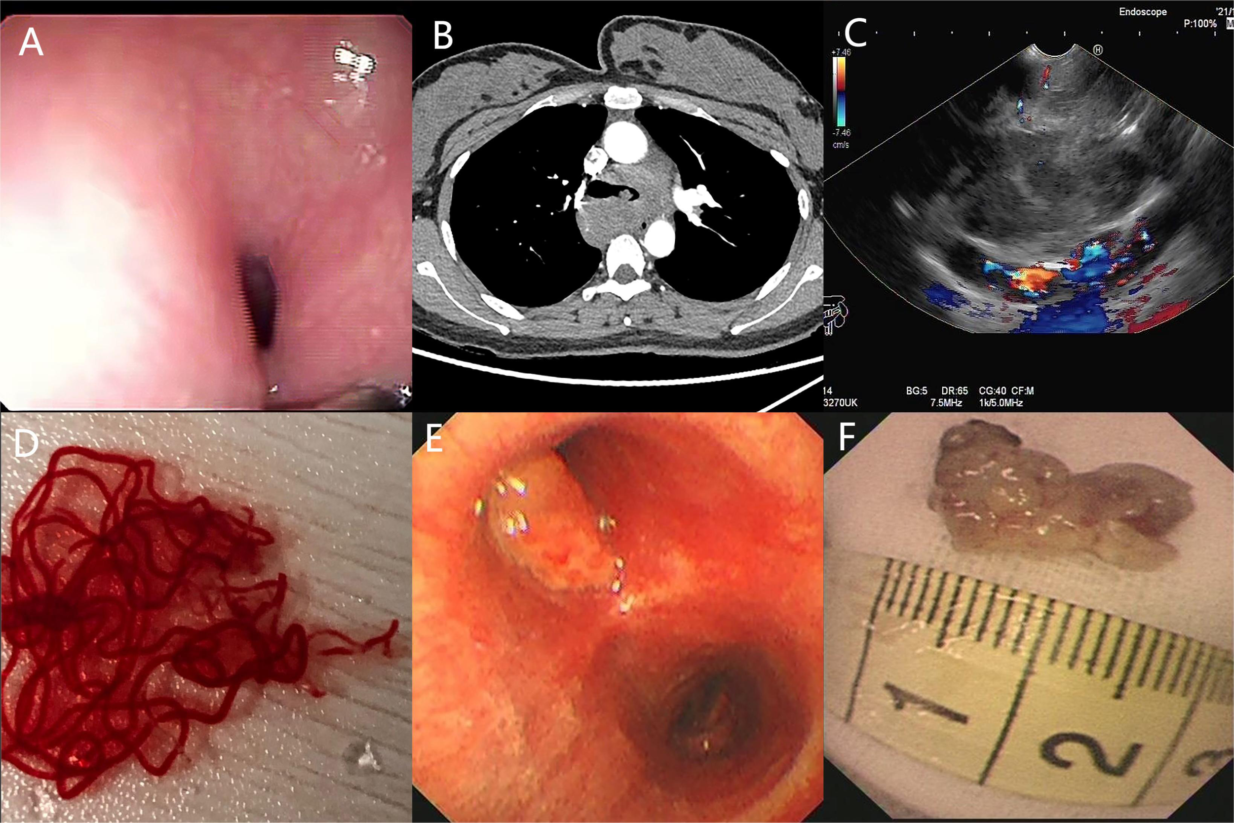 (A) Gastroscopy shows a huge submucosal bulge in the middle of the esophagus. (B) Contrast-enhanced computed tomography scan of the chest shows a left main bronchus nodule, mediastinal lymph node enlargement, and fusion with necrosis. (C, D) Endoscopic ultrasound reveals a 30 × 25-mm hypoechoic lesion arising from the mediastinal mass, and EUS-FNA was performed to obtain tissue from the mass. (E, F) Transbronchoscope biopsy was performed to obtain tissue from the left main bronchus nodule.