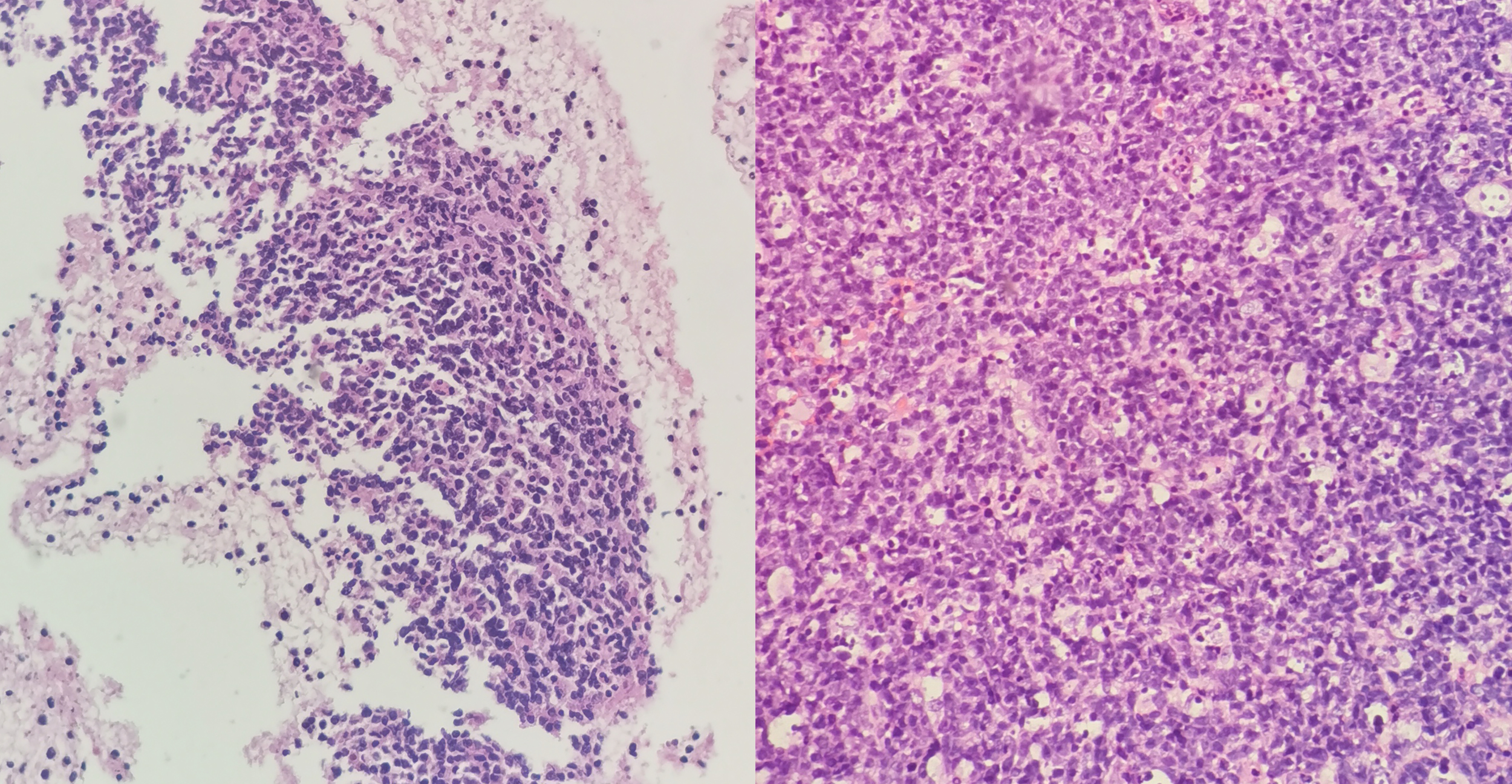 (Left) Hematoxylin and eosin (H&E) shows medium to large tumor cells with transparent cytoplasm of the mediastinal masses. (Right) H&E shows medium to large tumor cells with transparent cytoplasm of the left bronchus nodule.