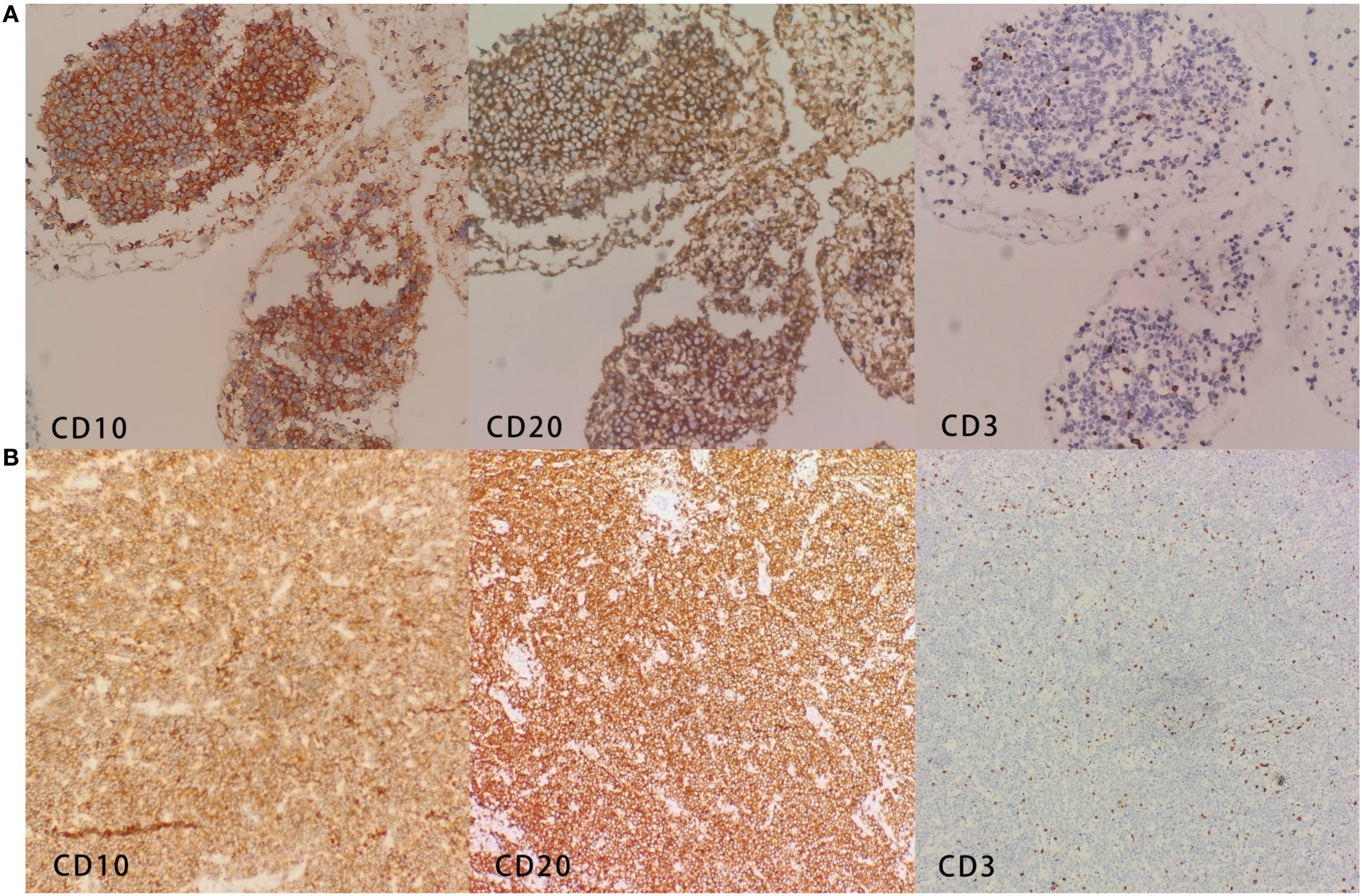 (A) Immunohistochemistry of the mediastinal mass shows CD10+, CD20+, and CD3−. (B) Immunohistochemistry of the left bronchus nodule shows CD10+, CD20+, and CD3−.