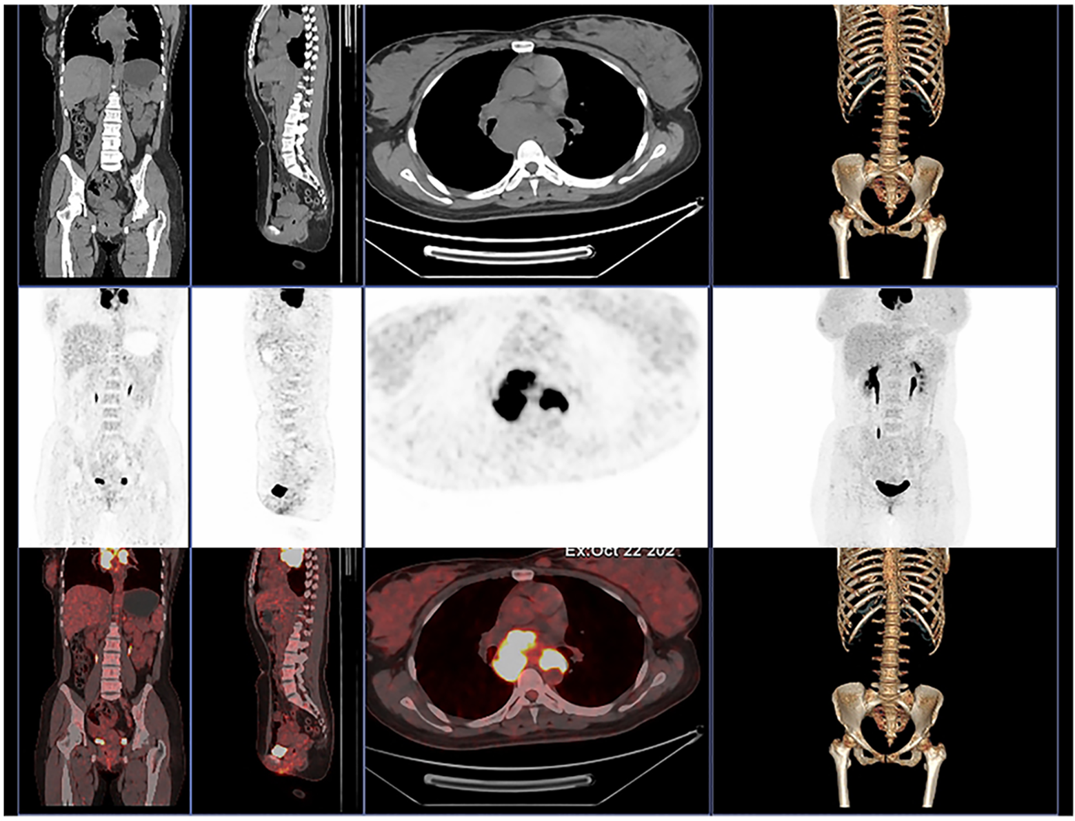 Moreover, in order to further evaluate the whole-body condition and choose the treatment, we did 18F-fluorodeoxyglucose positron emission tomography/computed tomography (18F-FDG PET/CT) examination on day 12 (Figure 4). The results indicated multiple enlarged confluent lymph nodes in the mediastinum with significantly increased glucose metabolism (5).