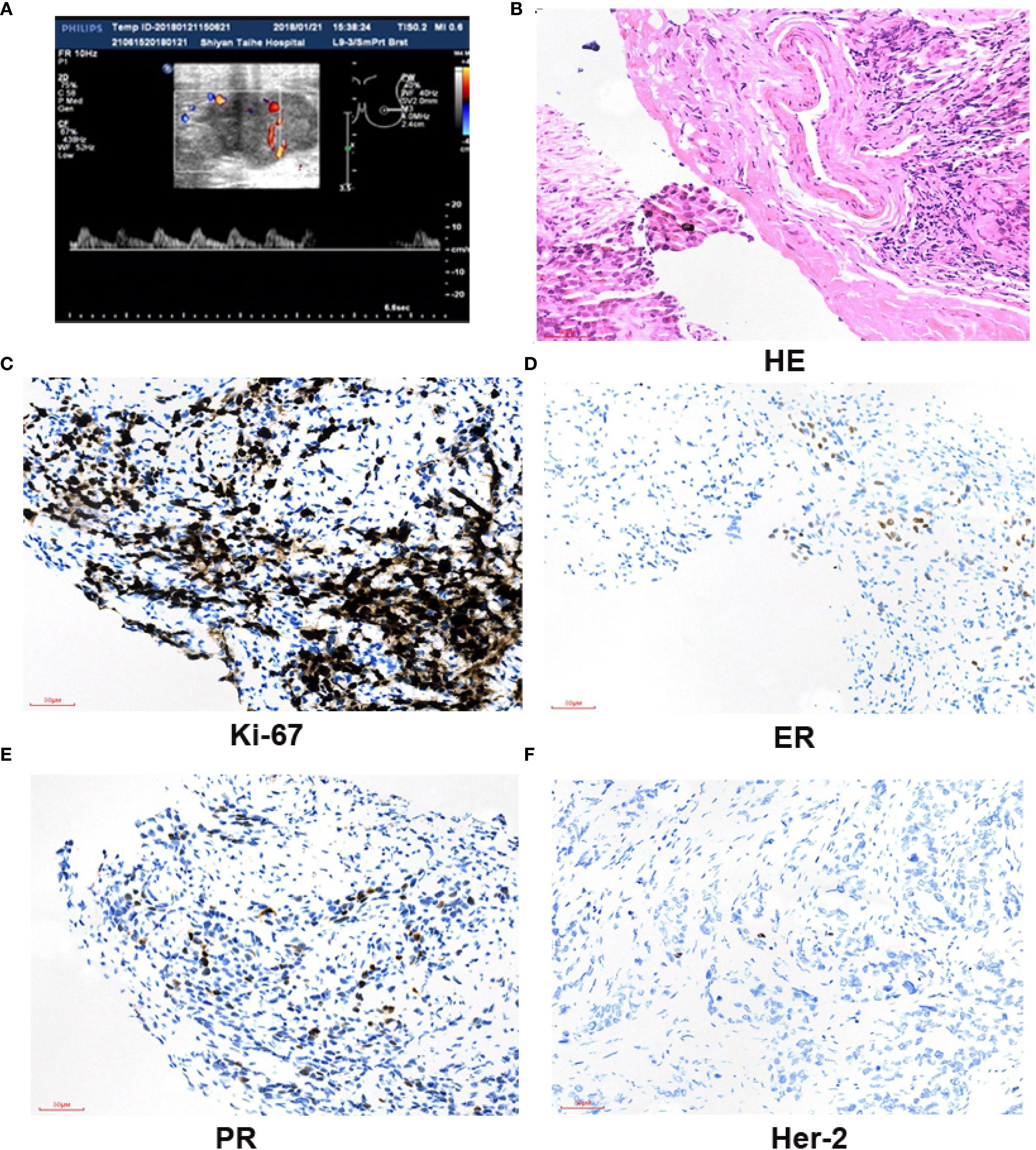 Figure 1. A breast mass in the left breast was biopsied; immunohistochemistry results. (A) Breast US images revealed a hypoechoic irregular mass in the left breast, with a size of about 40 × 35 × 24 mm. The boundary was uneven, and no strong punctate echo was observed. (B) Core needle biopsy of the mass (H&E, ×200); tumor cells displayed with a cord-like pattern, with some in a nest-like arrangement. The tumor cell nuclei are large, and scattered mitotic images could been observed. Dense fibrous connective tissue in the tumor stroma, eosinophilic staining, and lymphocytes could be observed around. Scale bar = 50 µm. (C) The positive staining of Ki-67 in cells is about 50% (×200). Scale bar = 50 µm. ER30%, moderate; PR10%, moderate; HER2 was negative (×200). Scale bar = 50 µm (D–F).