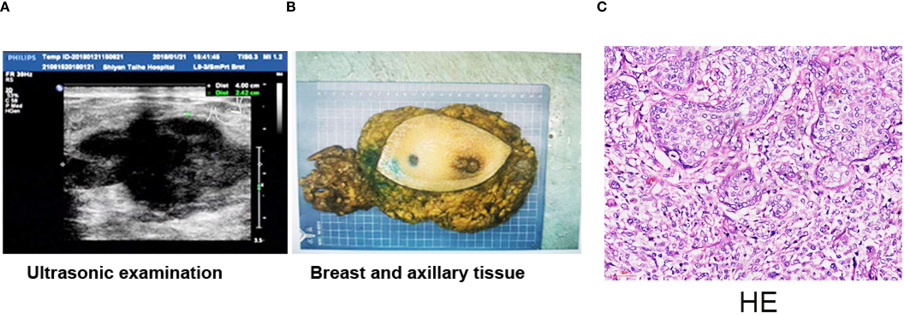 Figure 2. Breast mastectomy and H&E staining result of the tumor. (A) Breast US images revealed a hypoechoic irregular mass in the breast left upper quadrant, with a size of about 8.39 × 8.07 × 6.19 cm. (B) Whole excised tissue of the left breast. The mass was completely moved out with breast mastectomy. (C) The tumor was composed of two components: carcinoma and sarcoma components. The tumor cells in the cancer area are epithelial-like, locally nested, nuclear vacuolated, and scattered mitotic images. The tumor cells in the sarcoma area are scattered, of varying sizes, round or oval, and with large, vacuolar nuclei. Multinucleated tumor giant cells are often observed, and mitotic images are more common showing moderate to marked nuclear pleomorphism. Scale bar = 50 µm (H&E, ×200).