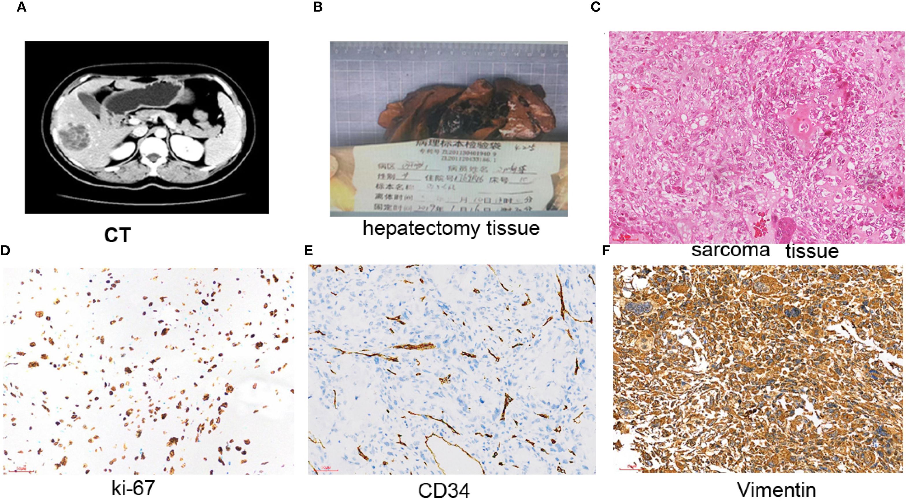 Figure 3. Liver metastasis was excised; immunohistochemistry results. (A) Enhanced CT indicated a 6.0 × 4.6-cm mass in the right lobe of the liver. (B) Whole excised hepatectomy tissue. (C) The tumor was composed of sarcoma components. The tumor cells are scattered, of varying sizes, round or oval, and with large and vacuolated nuclei. Displayed with obvious mitotic images and nuclear polymorphism. Multinucleated tumor giant cells are often observed, and mitotic images are common, with one to four small nucleoli. H&E, ×200. Scale bar = 50 µm. (D) Ki67 positive staining was about 50% in the nucleus in sarcoma components (×200). (E) CD34 was positive in stromal tissue (×200). Scale bar = 50 µm. (F) Positive staining with vimentin in the membrane and nucleus was observed in sarcoma components (×200). Scale bar = 50 µm.