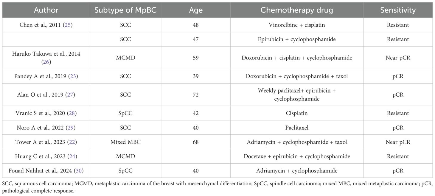 29. Noro A, Ishitobi M, Hanamura N, Kashikura Y, Yamashita M, Kozuka Y, et al. A case of metaplastic squamous cell carcinoma of the breast that showed a pathological complete response after neoadjuvant chemotherapy with weekly paclitaxel. Am J Case Rep. (2022) 23:e935035. doi: 10.12659/AJCR.935035