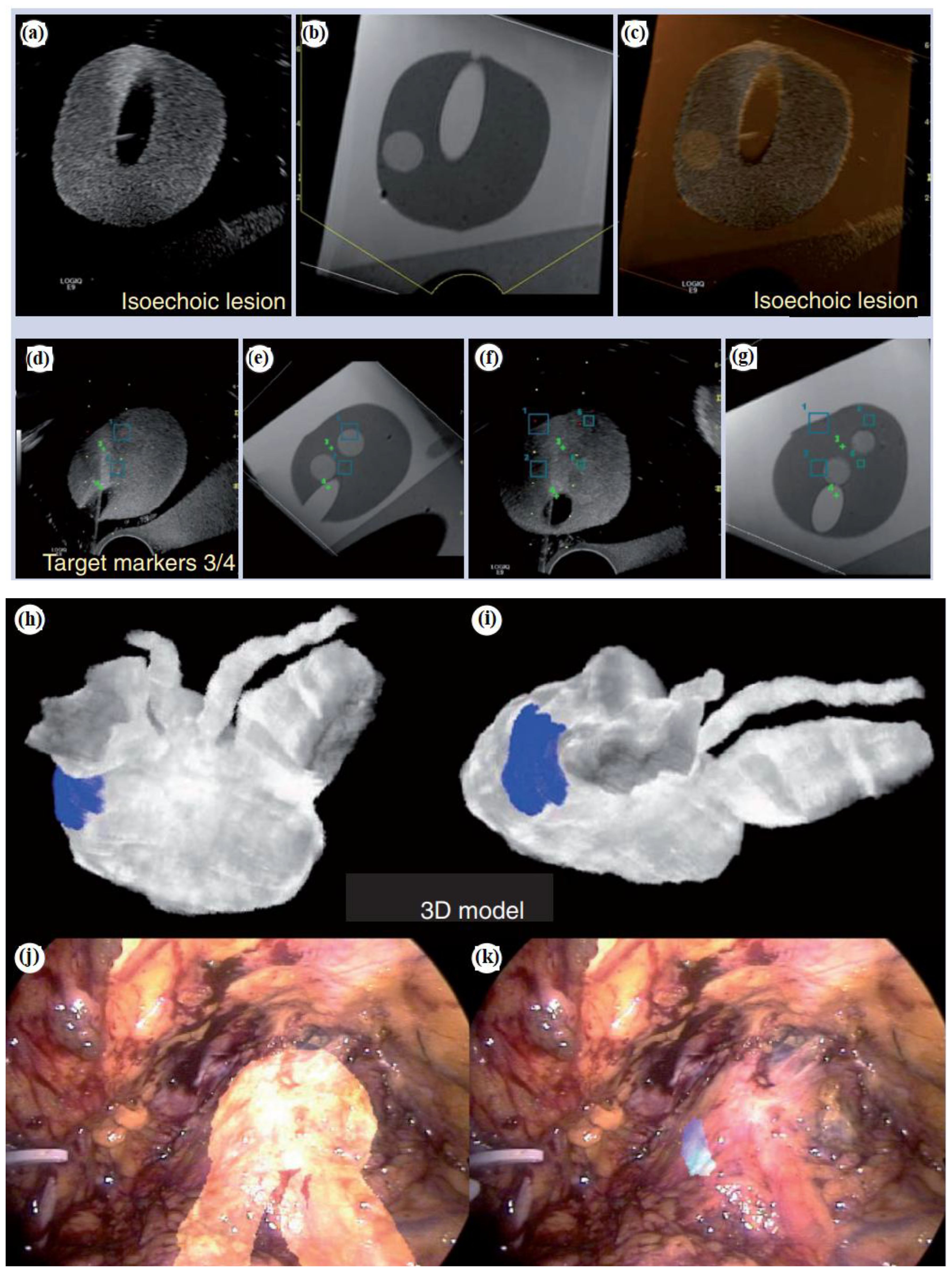 Figures 2b–k show the software platform for EUS/CT image fusion, which provide automatic processing of CT for 3D rendering and segmentation, nodule detection, organ/tumor segmentation, registration of patient’s CT for endoscopy procedures, localization and tracing of therapeutic devices using tracking technologies, virtual visualization of medical instruments on the CT stack, and augmented reality for virtual visualization of the patient’s anatomy over intraprocedural video (2). An earlier version of the software underwent testing using a specially constructed model of pig organs.
