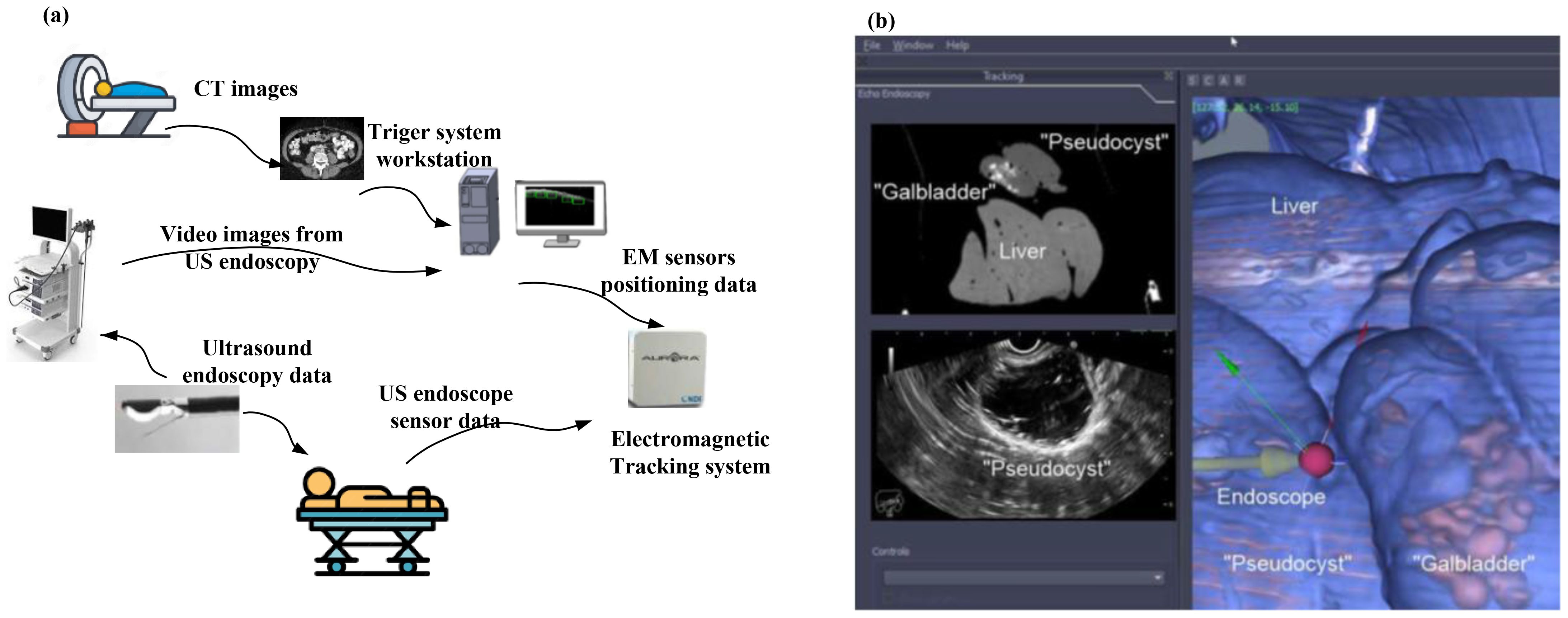Figure 2. (a) A typical image fusion framework. A virtual 3D map of the patient is created based on pre-procedure CT images. Subsequently, to overlay the EM sensor locations onto the 3D model, the image fusion software is used. To identify the clinical target, live EUS images are merged with the 3D model (2). (b) Real-time image fusion (EUS/CT) through which the 3D reconstruction of the segmented CT has been done (featuring a phantom “gallbladder with stones,” “pseudocyst,” and liver). The oblique section represents the co-registered large-field CT, which is showing all three organs. The narrow EUS image shows the pseudocyst [adapted from (2)]. Reproduced from (2) ([Journal]), licensed under CC BY 4.0.