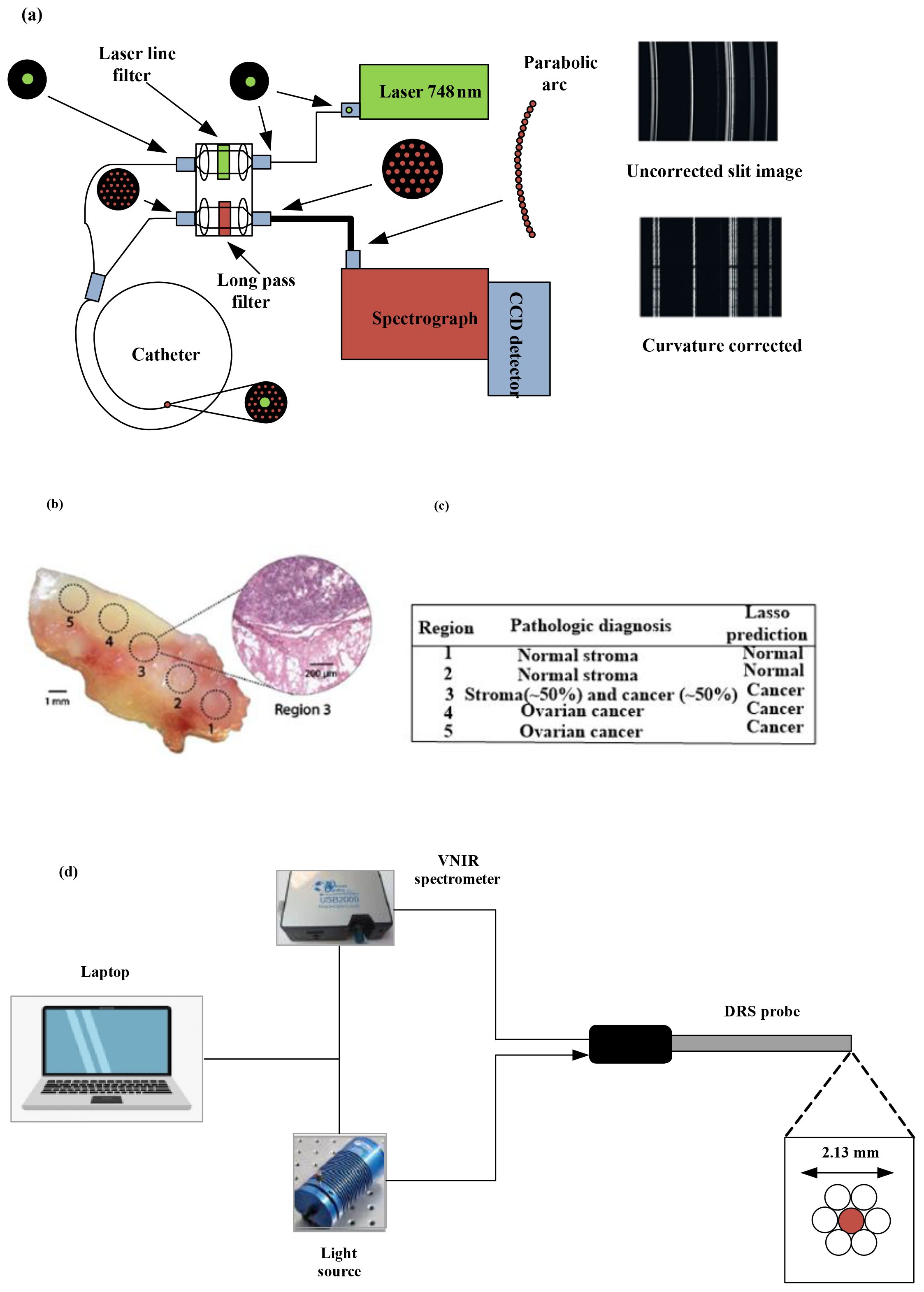Figure 3. (a) Diagram illustrating the high-speed, real-time Raman system designed to diagnose skin cancer [(4)]. (b) A mixed histologic composition in a highgrade serous ovarian cancer (HGSC) tissue sample analyzed with the MasSpec Pen. MasSpec Pen-based analysis on optical image of the tissue sample at regions 1 to 5, followed by freezing, sectioning, and hematoxylin and eosin (H&E) staining. The inset shows the H&E-stained tissue section from region 3. It reveals a mixed histologic composition that includes both cancer and adjacent normal stroma tissue. (c) The diagnosis of the five regions is shown in the table alongside the Lasso prediction results [reproduced from (24) Science Translational Medicine (Sci Transl Med). with permission from American Association for the Advancement of Science.]. (d) Setup and instrumentation for diffuse reflectance spectroscopy (DRS) for data acquisition and sample illumination. The DRS probe was connected to both the light source and the spectrometer. All electronic devices communicated with the software (11).