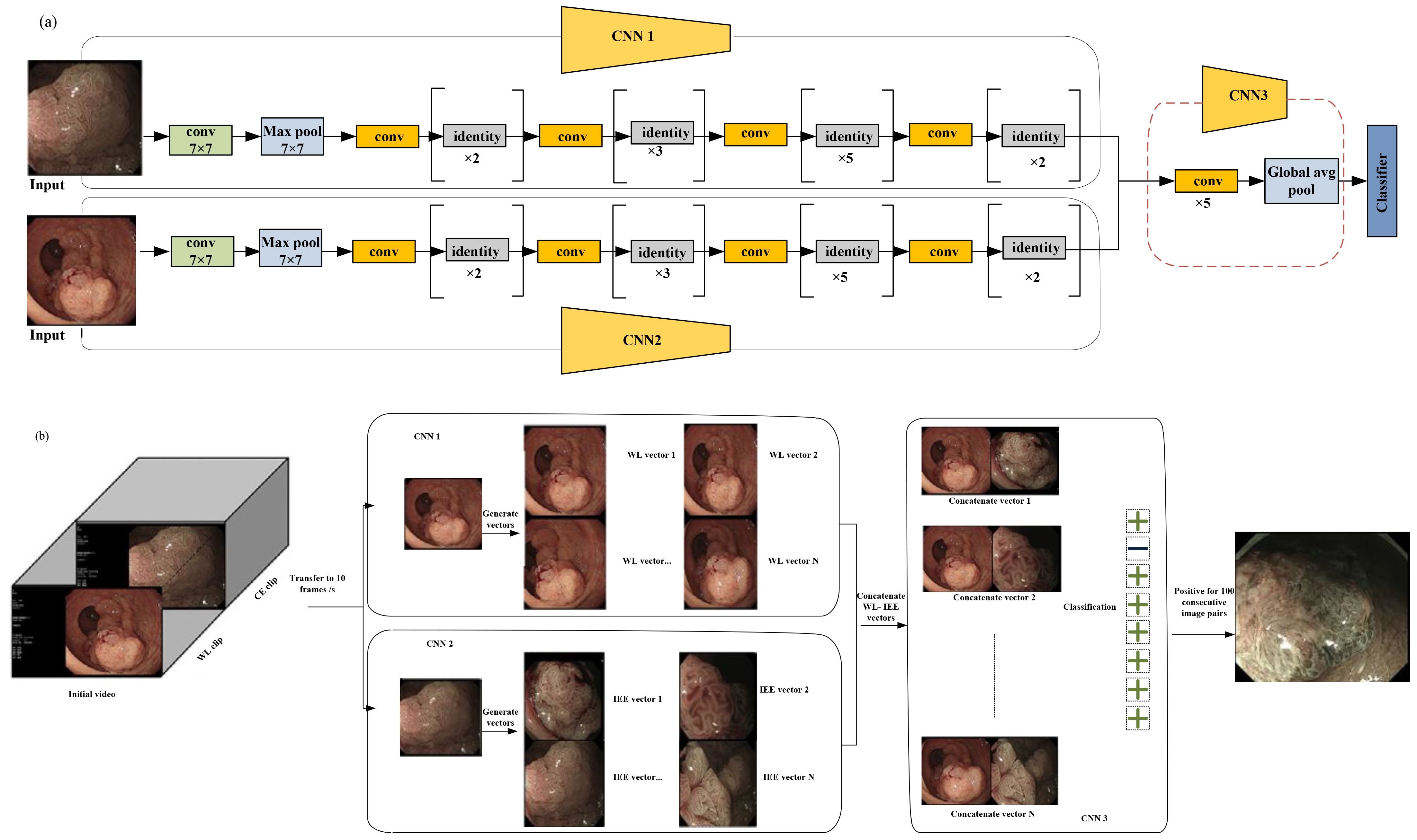 Two pretrained CNN1 and CNN2 models are based on ResNet-50. These models were used to obtain eigenvectors from the WL and IEE images. In each image pair, the IEE vector was concatenated with the WL vector, and the resulting combined vector was used to generate feature maps. Finally, these feature maps were used to classify a self-constructed CNN3 (32). To evaluate the clinical applicability of the endo-CRC system, video clips were used as the validation dataset.