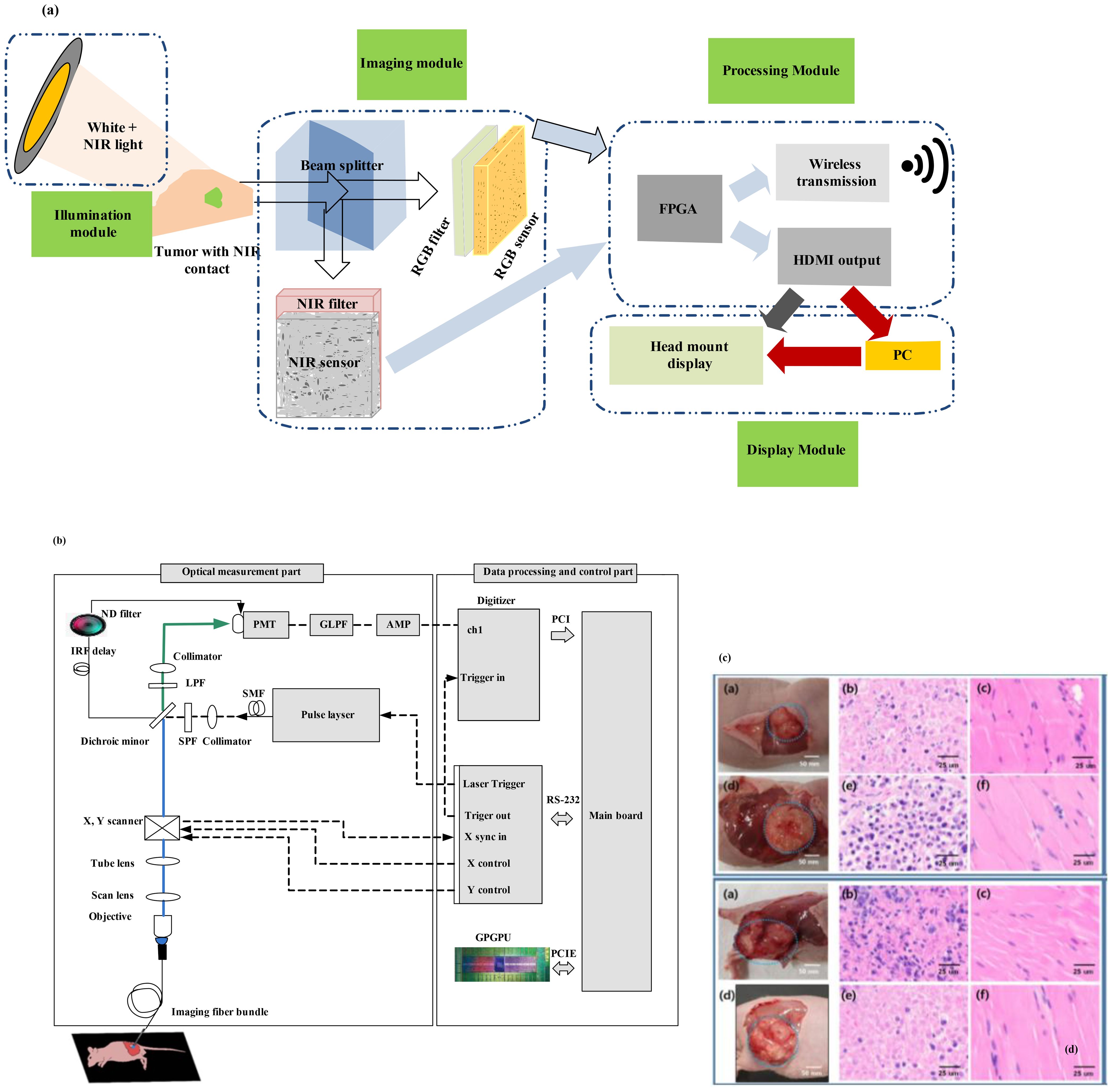 Figure 8. (a) Framework of the goggle augmented imaging and navigation system (GAINS) system with its different modules and information flow between the modules (36). Reproduced from (36), licensed under CC BY 4.0. (b) Schematic of the experimental setup for fluorescence lifetime endoscopy (FLE) (37). (c) Images at the top show the breast cancer model, and those at the bottom show the skin cancer model. (b) H&E staining results of tissues from the normal group and (c) from the tumor group [adapted from (37)]. Reproduced from (37), licensed under CC BY 4.0.