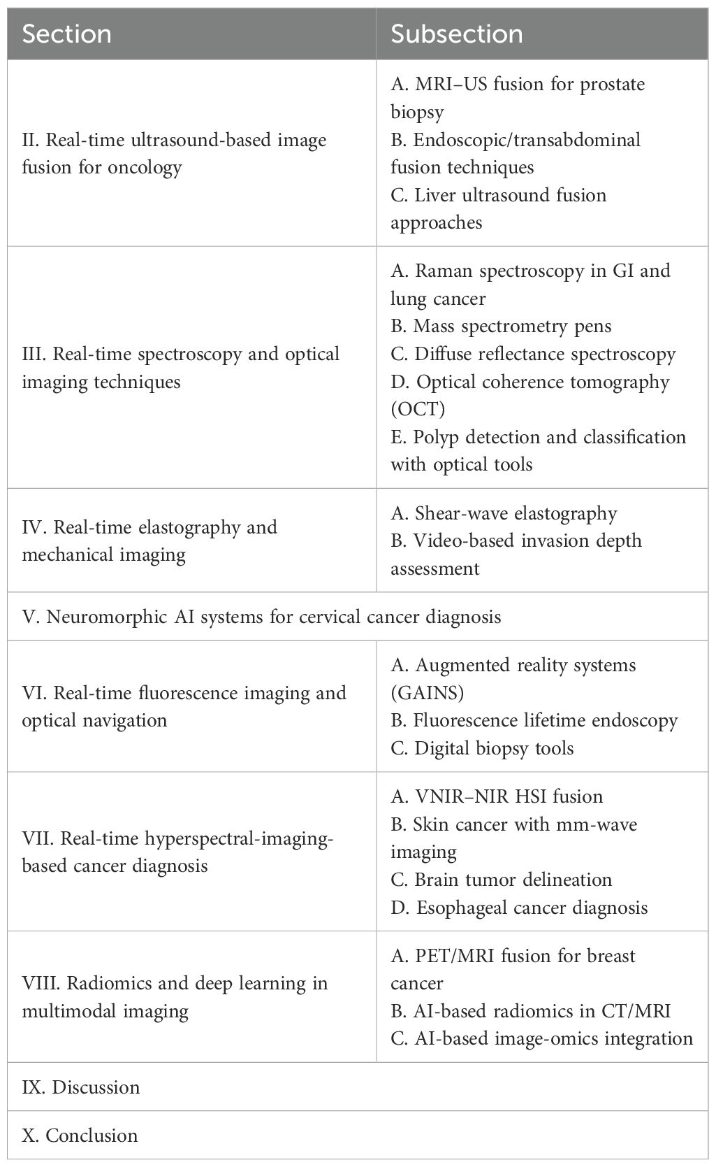 In this review, we specifically examine modalities that have been applied in real-time AI-based cancer diagnosis. For each technique, we detail not only its clinical application but also its technical parameters and maturity level. Table 1 shows the paper structure as follows. Section II discusses real-time US-based imaging and image fusion. Section III introduces real-time in vivo cancer diagnosis with different spectroscopy techniques and real-time optical imaging-based cancer diagnosis methods. Section IV explains elastography-based cancer diagnosis real time methods. Section V describes different real-time fluorescence image-based cancer diagnosis techniques. Real-time hyperspectral imaging-based cancer diagnosis is covered in Section VI. Section VII describes PET/MRI image deep learning for real-time breast cancer. In section VIII, we provide an overall discussion of the different approaches and future work. Finally, Section IX concludes the paper.