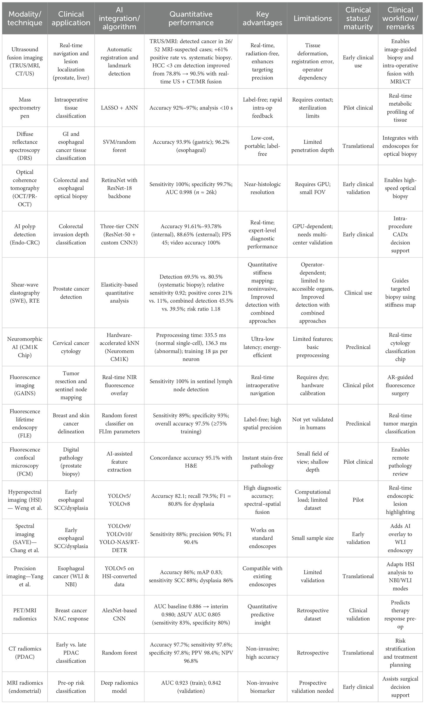 Although radiomics and multi-omics fusion approaches are not inherently real time, they provide essential preoperative insights that can inform intraoperative decisions. Their integration into AI-enhanced diagnostic pipelines exemplifies a holistic approach to cancer management, merging computational precision with personalized care.