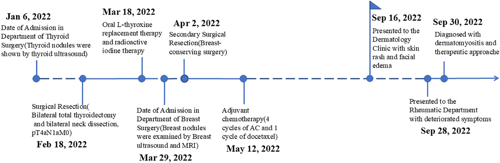 Thyroid and breast cancers are endocrine-related malignancies with the highest incidence in women and often occur metachronously (6). There is a clear increase in the odds of developing either thyroid or breast cancer as a secondary malignancy, suggesting a common etiology (7). Breast cancer accounts for approximately 20% of malignancies in patients with dermatomyositis, while few reported cases of dermatomyositis associated with papillary thyroid cancer have been reported (8). There are few studies on the combination of dermatomyositis and multiple primary cancers.