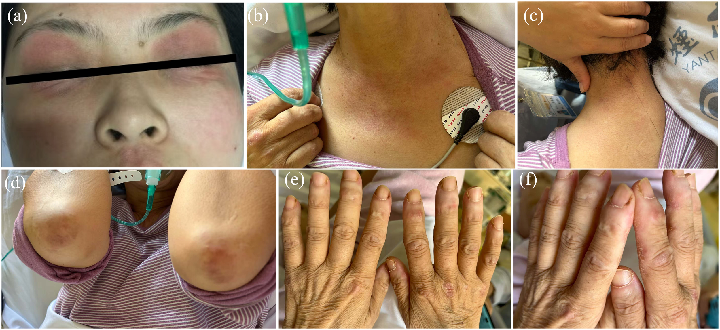 After one week, the patient’s general condition deteriorated. She presented with progressive pruritic erythema, worsening weakness, and proximal upper- and lower-limb myalgia. She had difficulty in raising her arms, squatting up and down, and flexing her neck. Subsequently, she experienced dysphagia, cough, and hoarseness, which prompted admission to the hospital for further management. On September 28, 2022, this patient presented to the Rheumatic Department. Physical examination revealed facial edema and generalized skin eruption, heliotrope rash of the bilateral eyelids, V-neck signs of the chest, Gottron’s signs of the knees and elbows, Holster’s sign, and shawl’s sign (Figure 3). Muscle strength of the proximal muscles of the limbs was diminished (4/5), while the other distal limb muscle groups had normal muscle strength. The rest of the physical examination results were unremarkable.