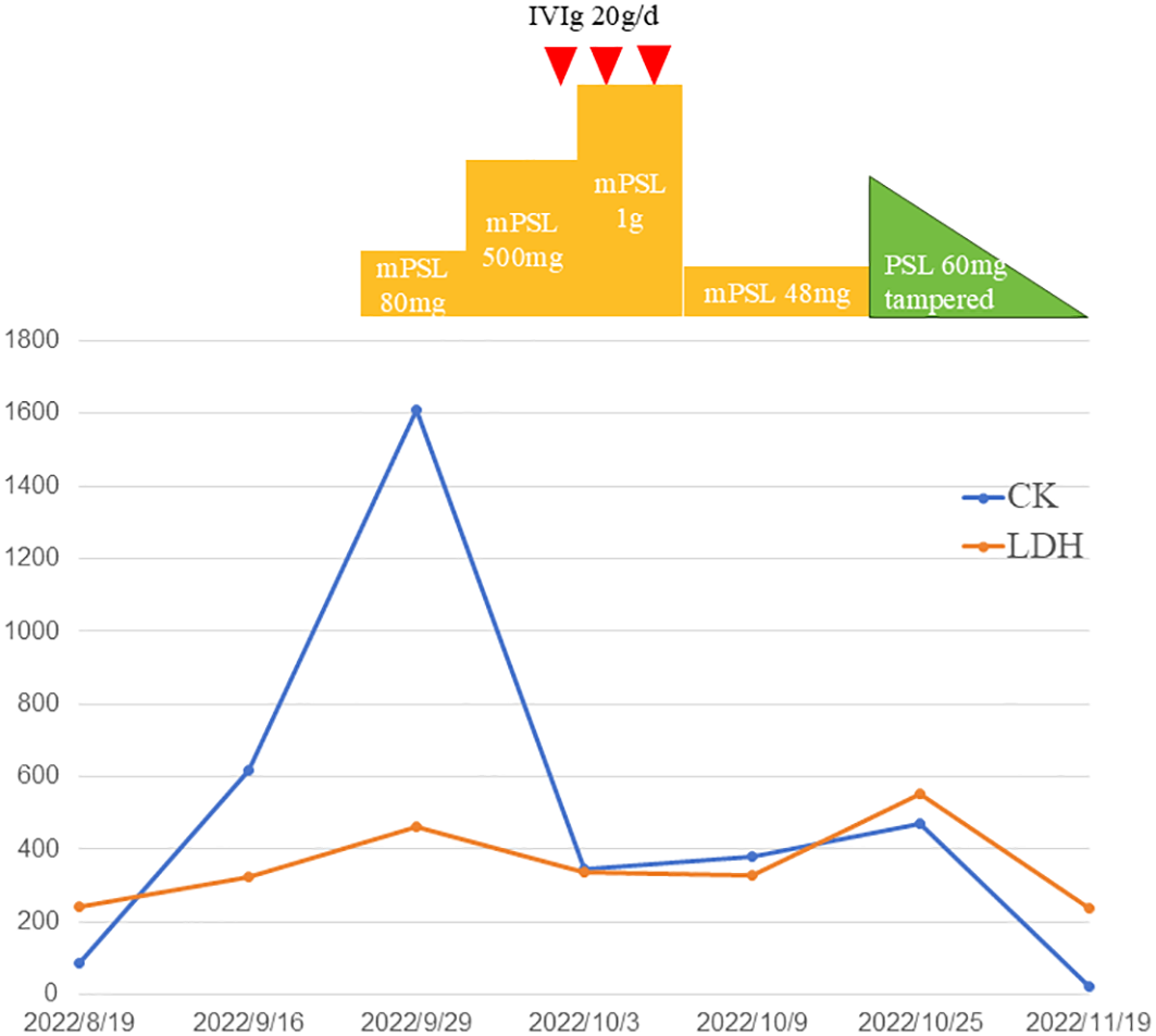 Temporal changes of creatinine kinase (CK) and lactate dehydrogenase (LDH). Treatments performed are indicated above the graph. PSL indicates prednisolone; mPSL, methylprednisolone; IVIg, intravenous immunoglobulin.