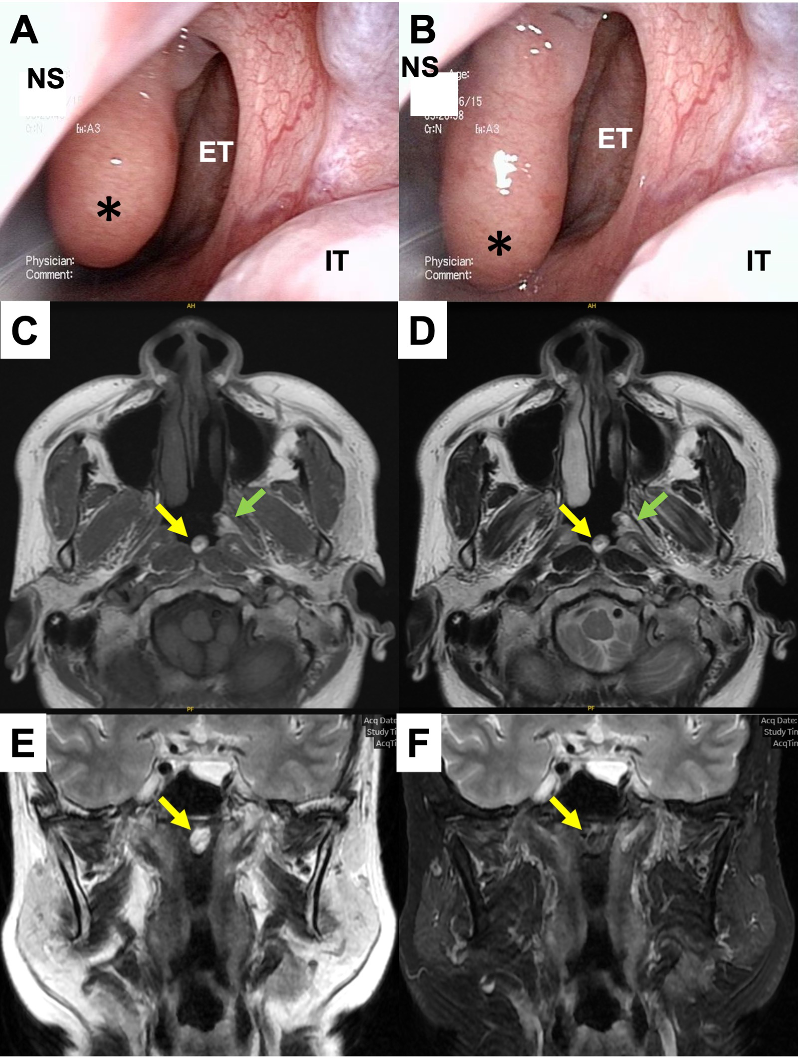 Preoperative findings. (A, B) Endoscopic findings in the left nasopharynx. A smooth-surfaced tumor originating from the nasopharyngeal superior wall was spontaneously contracting (A) and relaxing (B). *, the tumor; NS, nasal septum; ET, Eustachian tube; IT, inferior turbinate. (C–F) MRI findings at the level of the nasopharynx. The tumor showed high intensity including partial iso intensity in both T1 (C) and T2-weighed images (D, E). In a fat-suppressed image, the intensity of the tumor turned low signal (F).