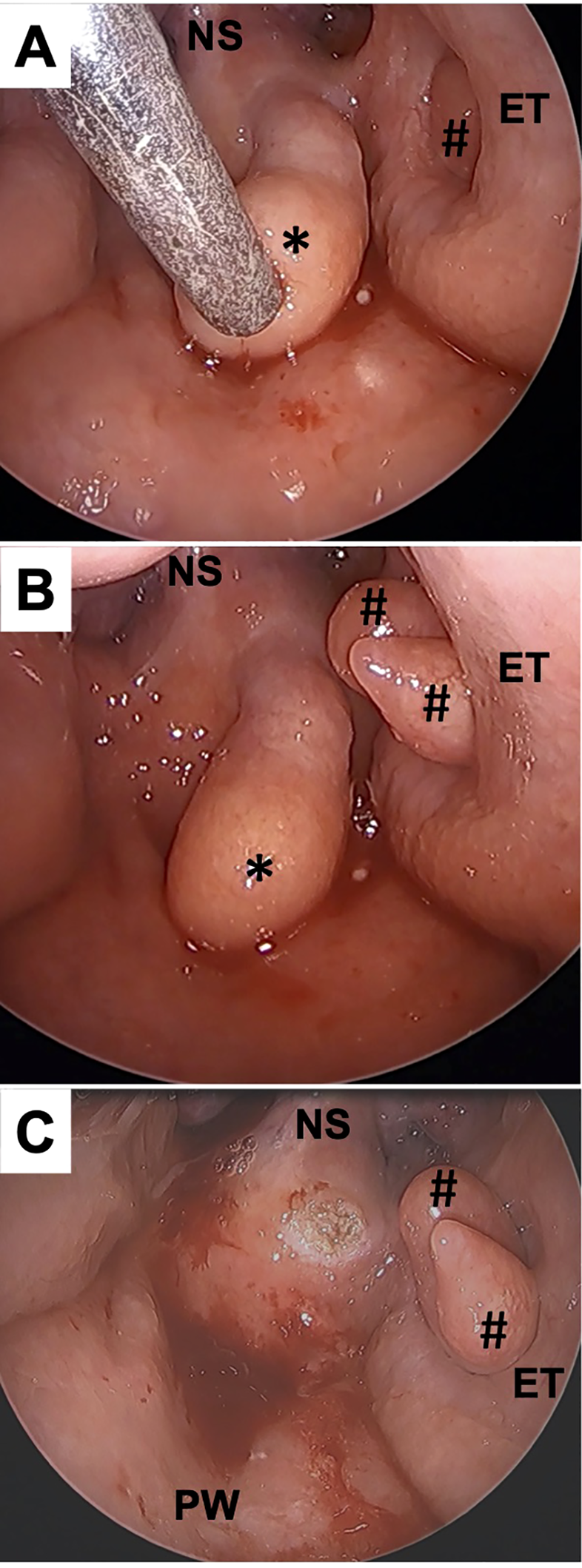 Intraoperative findings. A 70° rigid endoscope was trans-orally inserted to the oropharynx. Multiple tumors were observed in the nasopharynx. The tumor in the Eustachian tube showed spontaneous contraction (A) and relaxation (B). The tumor arising from the superior wall (*) was resected with a coblator without bleeding (C). #, the tumors in Eustachian tube; NS, nasal septum; ET, Eustachian tube; PW, posterior wall of the nasopharynx.