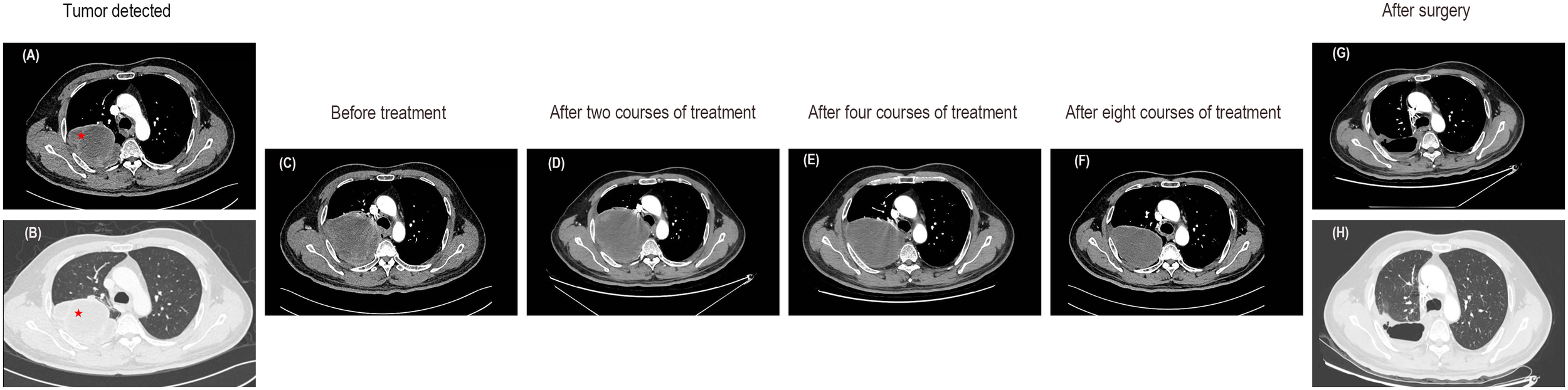Enhanced CT images of the lung mass. (A, B) CT images at the time of tumor detection. (C) The CT images before any treatment. (D) Enhanced CT scans after two courses of treatment indicated a slightly enlarged tumor with an overall stable efficacy. (E) A subsequent CT scan after the fourth course of treatment showed stable disease. (F) The CT images after eight courses of treatment suggested a decrease in tumor size. (G, H) Enhanced CT revealed no tumor recurrence after surgery.