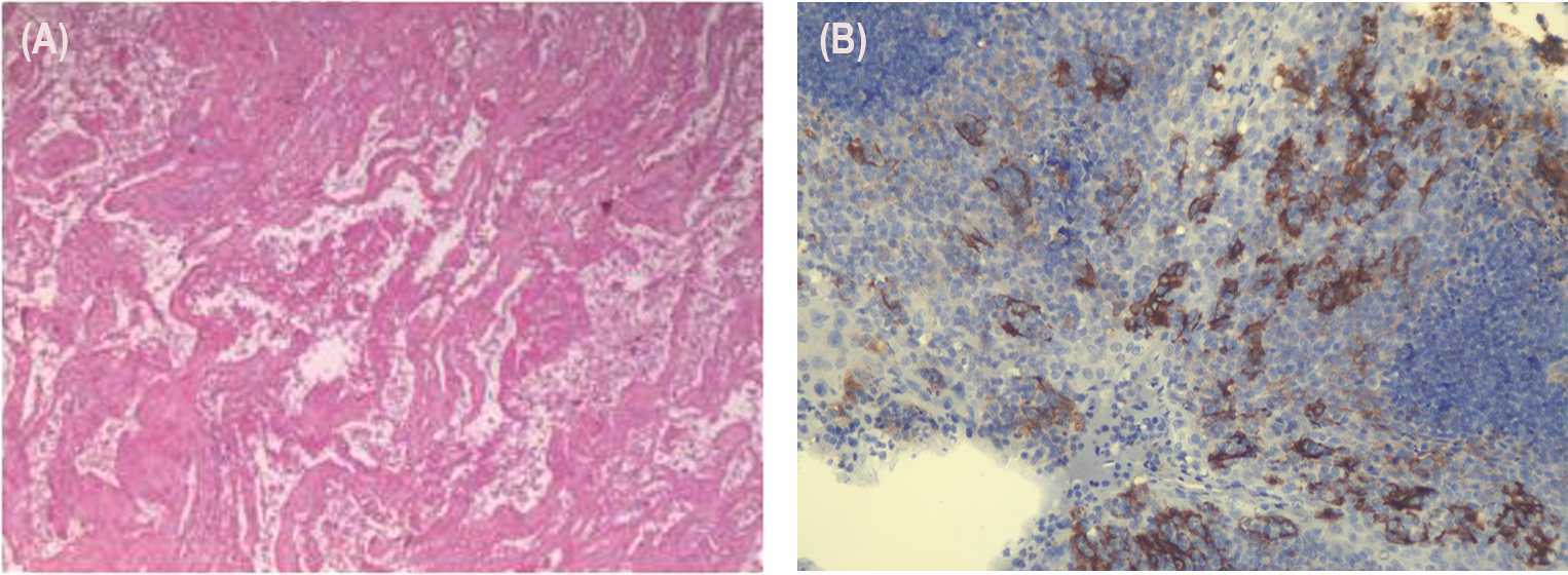 The postoperative pathology results were as follows: (1) In the right upper lung, consistent with changes after tumor chemoimmunotherapy, no residual viable tumor cells were found in the tumor bed. (2) There was diffuse congestion and hemorrhage in the peripheral lung tissue, with no tumor tissue observed at the bronchial margin. (3) No tumor metastasis was observed in the lymph nodes of groups 2, 4, 7, 10, and 11, and the subcarinal lymph node (0/3, 0/3, 0/1, 0/1, 0/2, 0/2) (Figure 3A). The immuno-histochemistry results of the surgical tissue indicate a PD-L1 (TPS of 40%) (Figure 3B).
