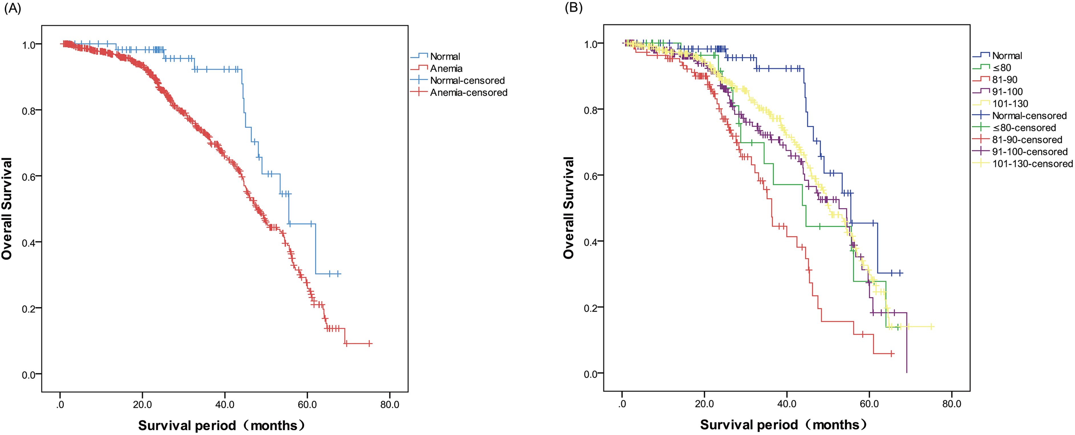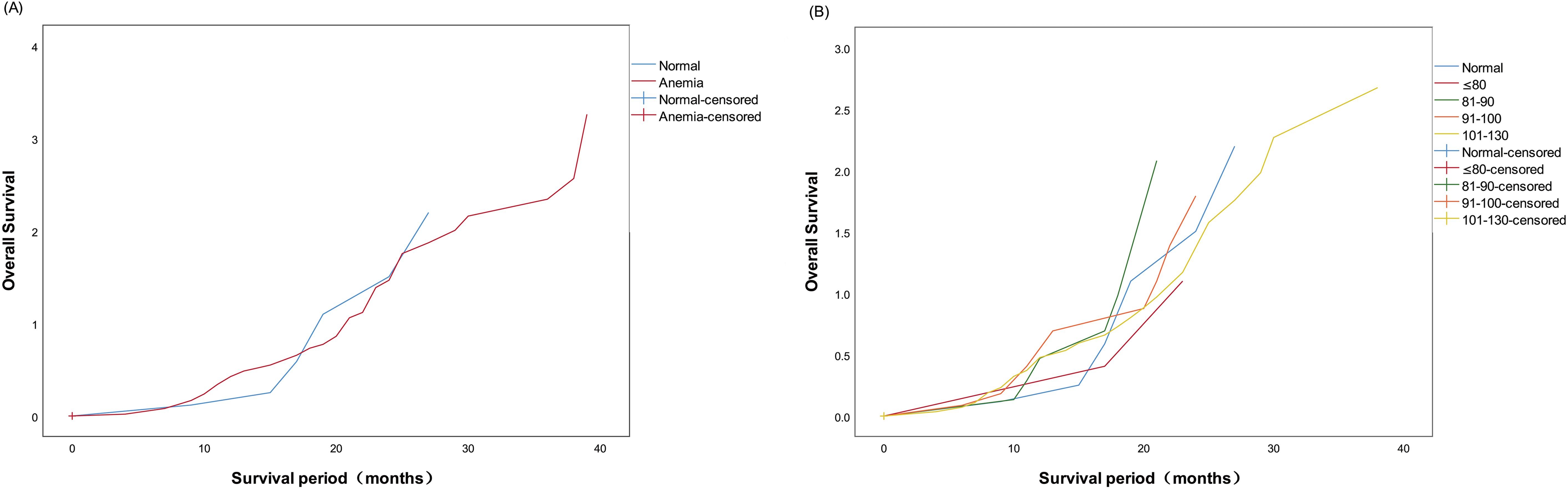 Figure 1. (A) Kaplan–Meier curves presenting postoperative overall survival (OS) in the normal and anemia groups. (B) Kaplan–Meier curves presenting postoperative OS in the anemia subgroups.