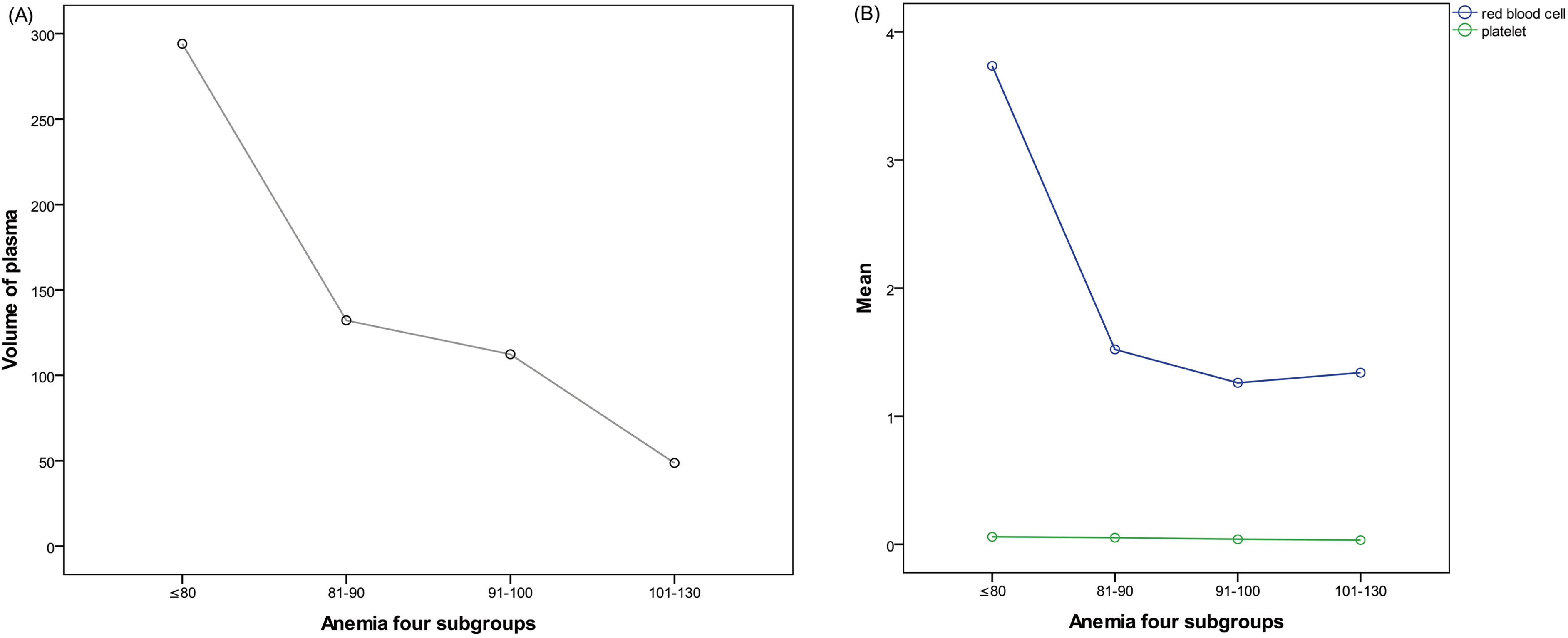 The anemic patients received postoperative transfusions of blood components depending on hemorrhaging, oxygen deficiency, and other symptoms, the results of Hb and platelet testing, and coagulative function. RBC infusion was given when the Hb level was less than 70g/L, platelet transfusion was performed when the cell count dropped below 20×109/L, and plasma transfusion was given to patients with abnormal coagulation function. There were significant differences in the volumes of plasma and RBC transfusions among the four anemia subgroups (all P < 0.05), whereas that of platelet transfusion was similar across all subgroups (F=0.107, P=0.956). The results have been summarized in Table 4 and Figure 3.