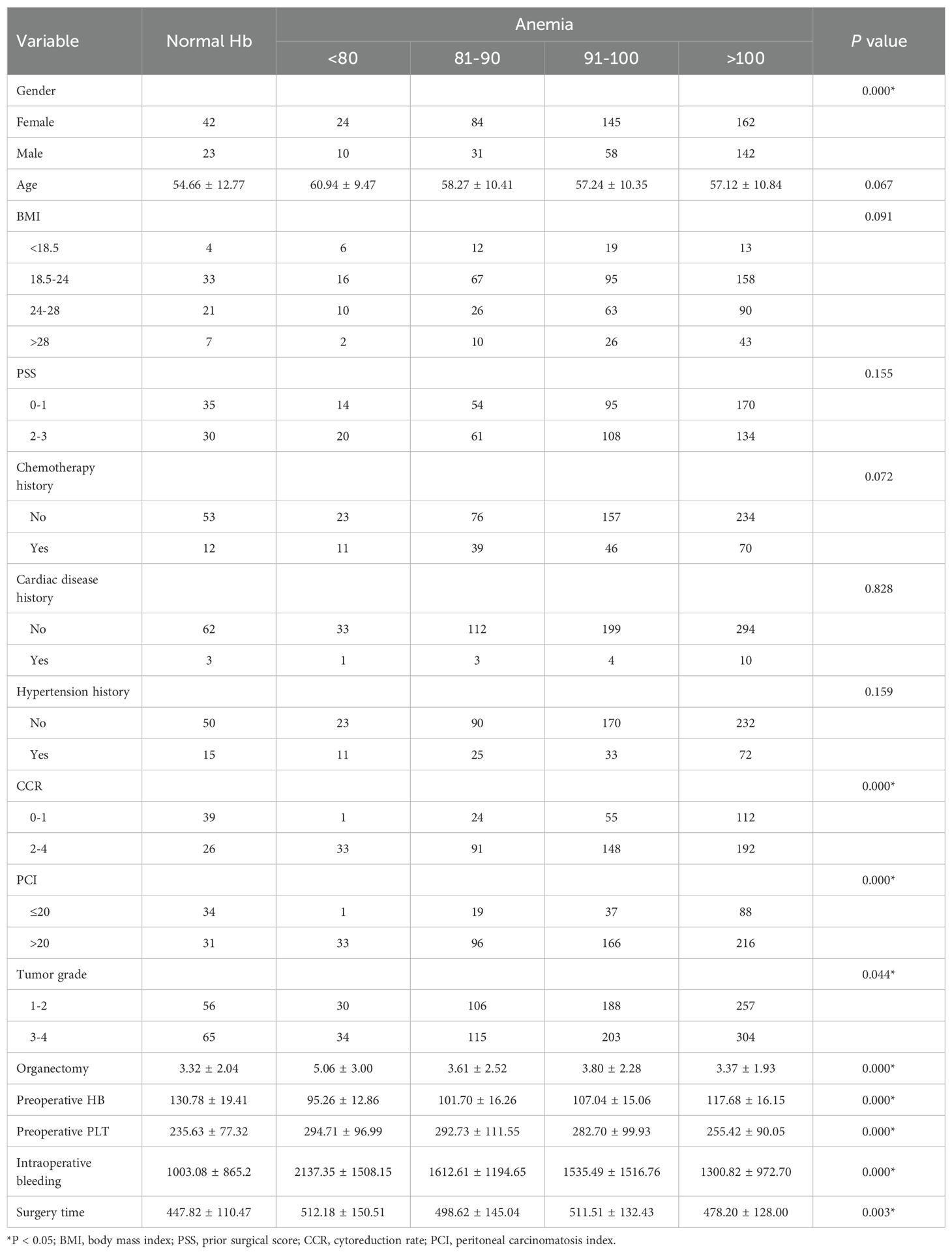 Continuous variables were presented as the mean ± standard deviation, and the different groups were compared by independent t-tests. Categorical variables were presented as absolute numbers and proportions, and the data were compared between the groups using the chi- squared test. The survival and recurrence rates were calculated by the Kaplan–Meier method and compared between the different groups and subgroups using the log-rank test. Univariate and multivariate Cox regression models were established to identify the independent risk factors for postoperative OS and tumor recurrence. BMI, CCR, PCI, tumor grade, preoperative Hb levels, PSS, and history of chemotherapy were selected as covariates to assess the effects of anemia and its severity on survival. SPSS 26.0 was used for all statistical analysis, and P < 0.05 was considered statistically significant.