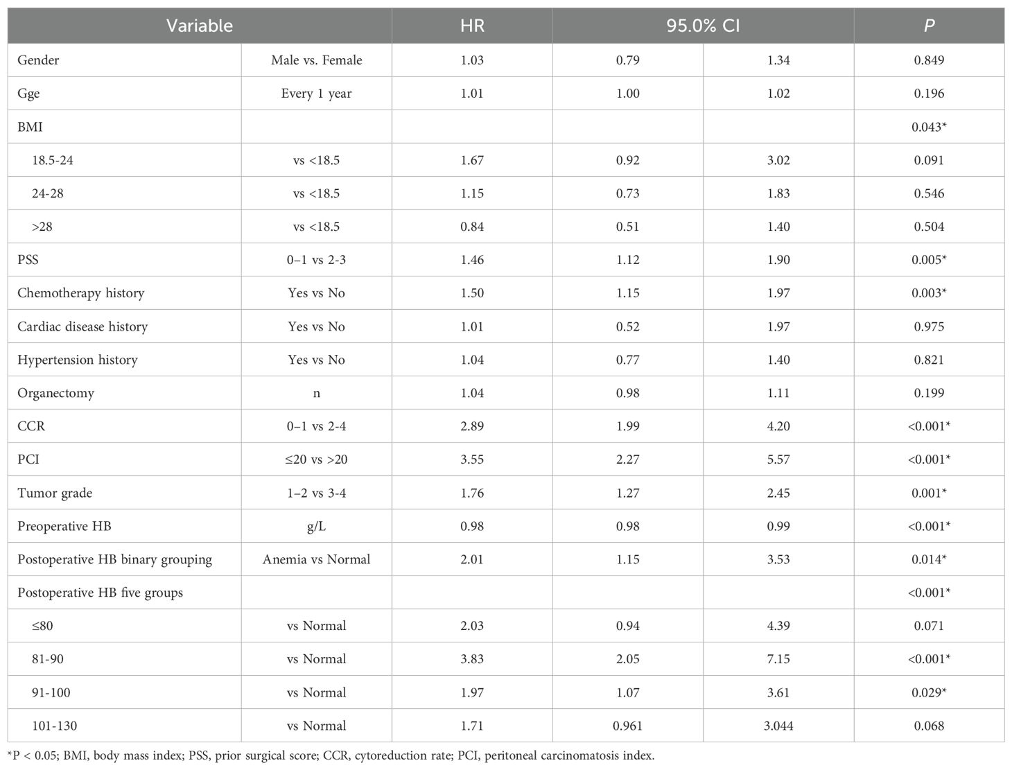 Owing to its single-center, retrospective design, this study had certain limitations. Given the high rate of postoperative anemia in patients with PMP, there were fewer patients with normal Hb levels, which necessitated an increase in the sample size to enhance statistical efficiency. Moreover, we only examined the correlation between the degree of postoperative anemia and patient prognosis. Further research is needed to assess the impact of preoperative anemia on prognosis. There are several possible reasons that may explain the poor prognosis in patients with postoperative anemia. First, the oxygen carrying capacity of patients with anemia is reduced (55), leading to insufficient oxygen supply that impairs tissue repair and slows down the healing. Second, due to the characteristics of PMP and the complexity of surgery, the reconstruction of gastrointestinal function after surgery directly affects the nutritional status of patients. Malnutrition can trigger or aggravate anemia (56, 57), weaken the immune system, and increase the risk of postoperative infection. Third, the insufficient oxygen supply caused by compensatory anemia leads to increased cardiac load, resulting in increased risk of ischemia and thrombosis (58). Finally, anemia also reduces the patient’s ability to move (59), resulting in prolonged and poor recovery after surgery.