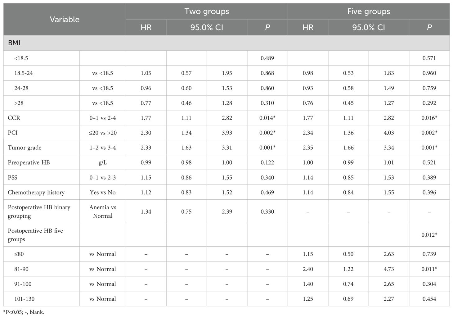 The univariate Cox regression model revealed that BMI < 18.5 kg/m2, PSS 2–3, history of chemotherapy, postoperative CCR2–4, PCI > 20, tumor grade 3–4, preoperative Hb levels, and postoperative Hb levels of 81–90 and 91–100 g/L were significantly associated with postoperative OS in patients with PMP (all P < 0.05, Table 2). Furthermore, multivariate Cox regression analysis identified postoperative CCR2–4, PCI > 20, and tumor grade 3–4 as the independent risk factors for postoperative OS in the normal Hb group and all anemia subgroups (all P < 0.05, Table 3). The postoperative Hb level was identified as an independent risk factor for postoperative OS when comparing the four anemia subgroups to the normal Hb group (P=0.012, Table 3).