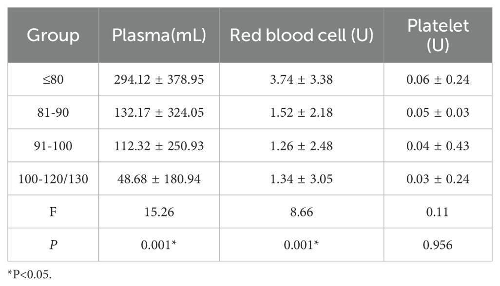Transfused blood components were supplied by the Beijing Red Cross Blood Center. Red blood cells (RBCs) were either suspended or leuko-reduced in 1 U/2 U packets. Transfusions were ABO- and Rh-compatible, which was verified by cross-matching. All transfused components were irradiated with 25–30 Gy gamma radiation. In addition, ABO- and RhD-compatible frozen plasma samples (100 mL/200 mL) were obtained and thawed at 37°C for 25 min prior to transfusion.