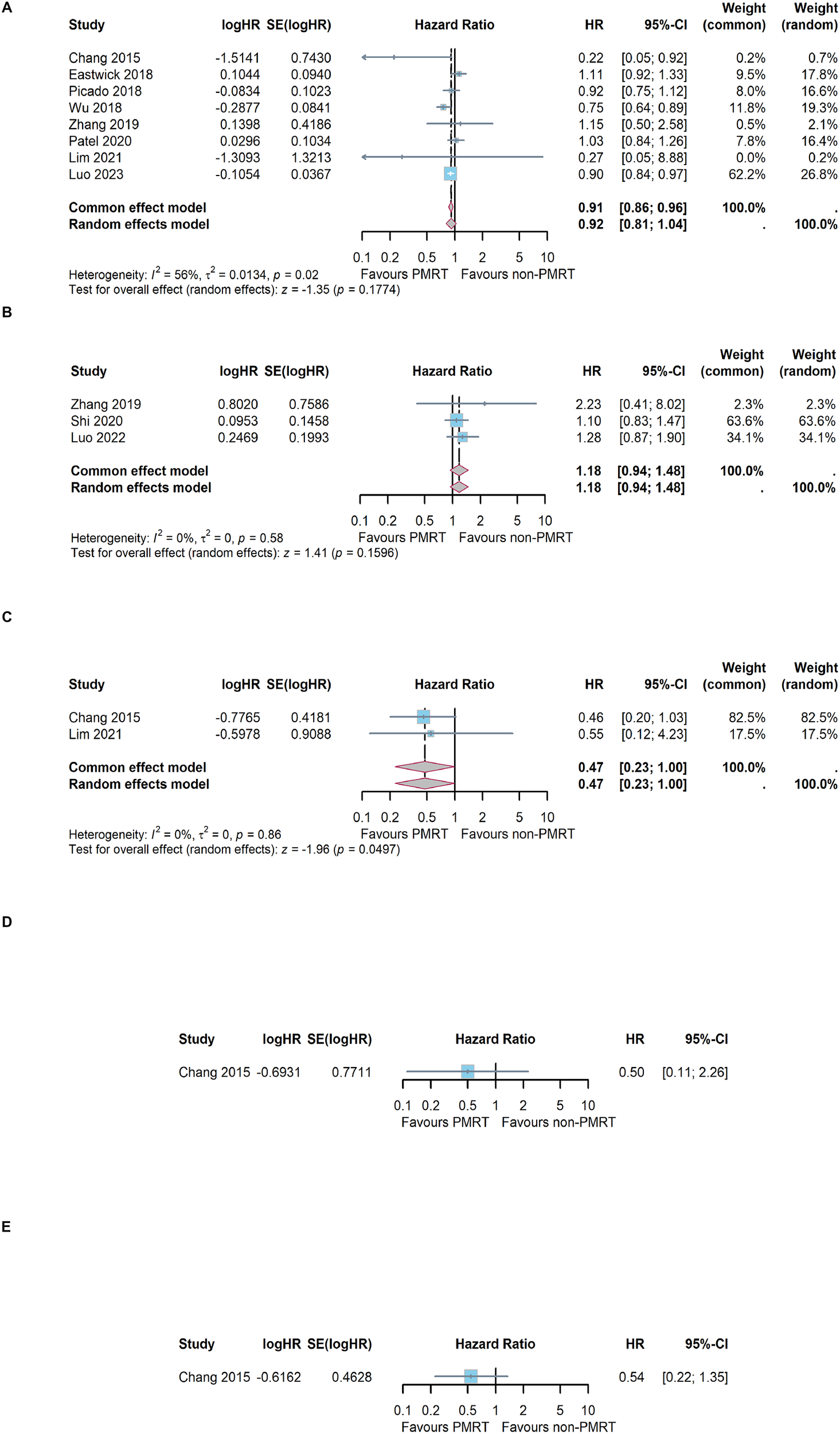 Meta-analysis results of different survival outcome. (A) overall survival, (B) breast cancer-specific survival, (C) disease-free survival, (D) local recurrence free survival and (E) distant-metastasis free survival.