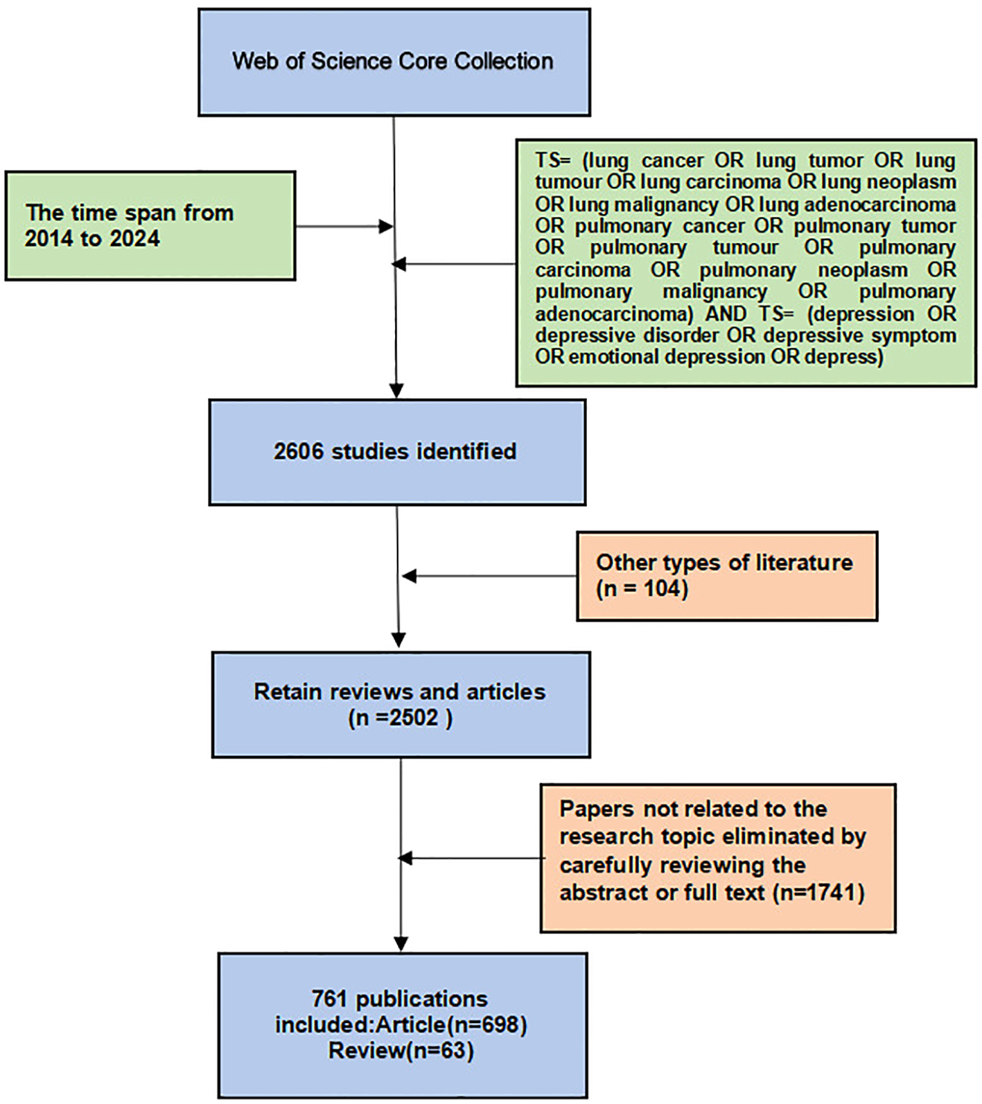 We utilized the search terms “lung,” “cancer,” and “depression” along with their relevant synonyms or abbreviations, followed by a comparison of respective findings to ensure the integrity and accuracy of our search results. The search query was TS= (lung cancer OR lung tumor OR lung tumour OR lung carcinoma OR lung neoplasm OR lung malignancy OR lung adenocarcinoma OR pulmonary cancer OR pulmonary tumor OR pulmonary tumour OR pulmonary carcinoma OR pulmonary neoplasm OR pulmonary malignancy OR pulmonary adenocarcinoma) AND TS= (depression OR depressive disorder OR depressive symptom OR emotional depression OR depress). The inclusion criteria of this study were as follows (1): studies published between January 1, 2014, and December 31, 2024 (2); studies that were an “article” or a “review article”, with no limitation in the language of the publication. The following exclusion criteria are established: 1) Exclusion of letters, meeting abstracts, meetings, proceeding papers, editorial materials, early access publications, and other non-article or article review literature; 2) Literature that is not pertinent to the research topic will also be excluded.