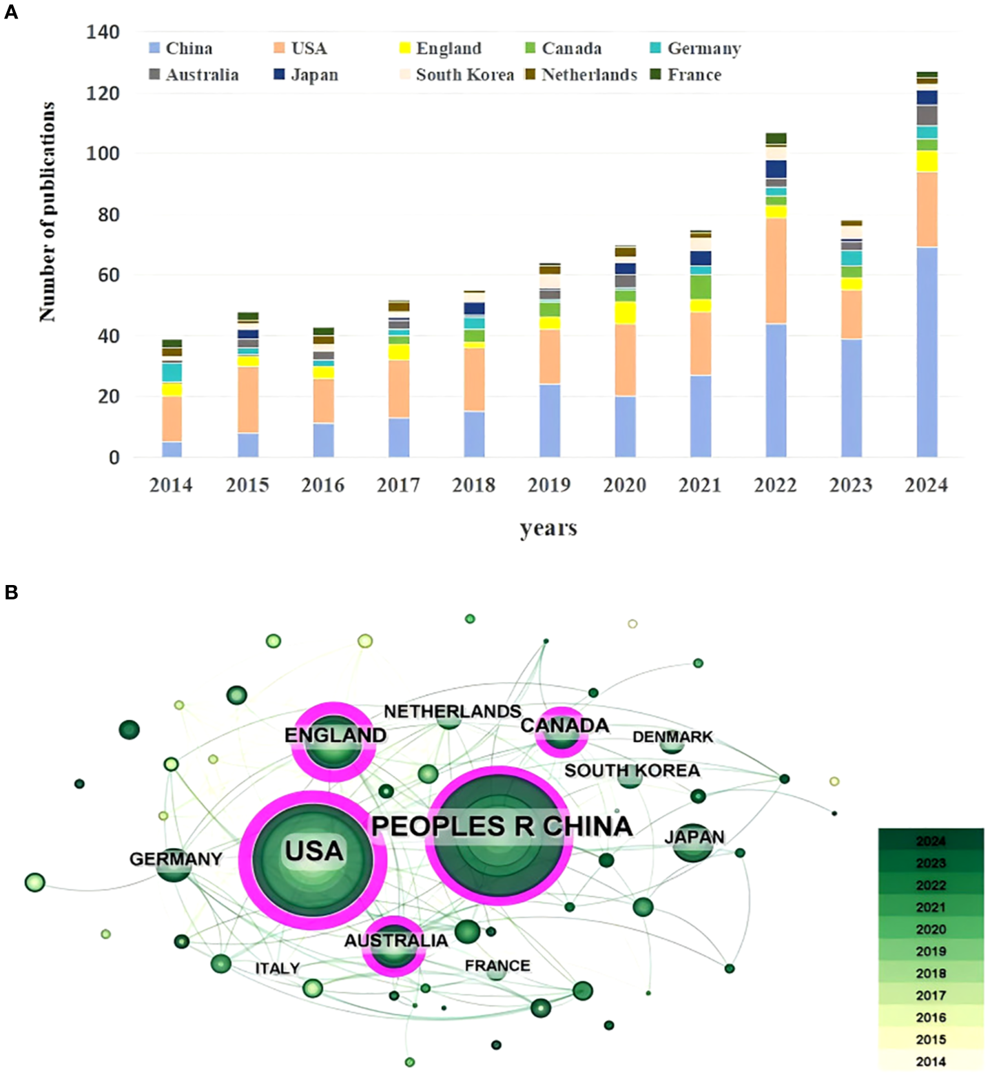 Research on depression in lung cancer is a globally recognized subject, over the span of 2014-2024, contributions from 58 countries were observed in the selected publications. The top ten productive countries were ranked, as shown in Table 1. Figure 3A illustrates the changes in publication output for the top 10 countries from 2014 to 2024. In terms of the number of publications, China remained the most productive (275, 36.14%), followed by the USA (231, 30.35%), and England (48, 6.31%). The greater the centrality, the stronger the partnership. The top three countries in terms of centrality were the USA (0.43), England (0.41), and Australia (0.19). Despite holding the position of the country with the highest number of publications, China exhibits a significantly lower level of centrality compared to the USA(0.43), which ranks second, and England(0.41), which ranks third. This indicates that both the USA and England possess a relatively strong influence in the field of lung cancer-related depression, which could potentially motivate China to publish articles of higher quality.