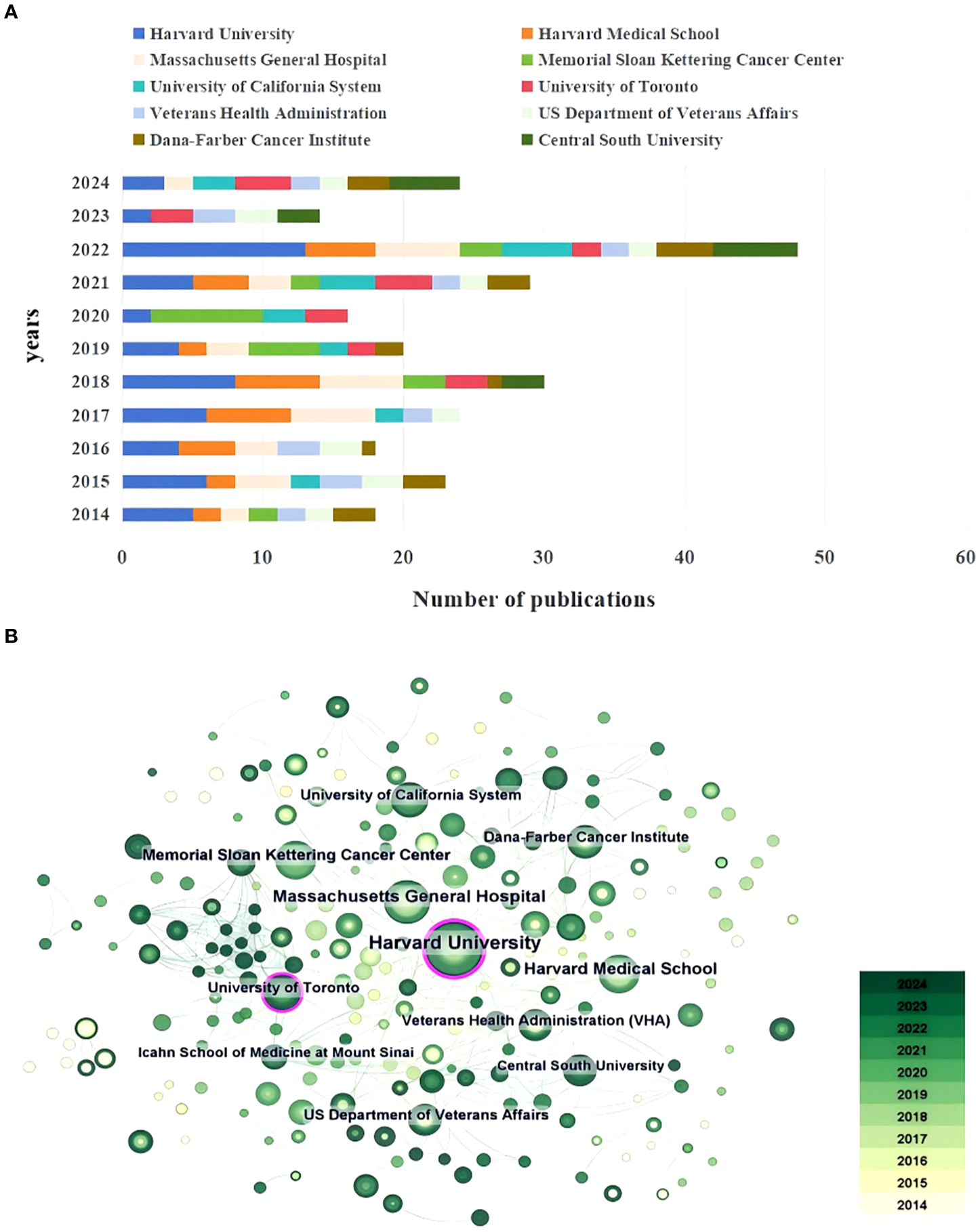 The cumulative annual publications of the top 10 institutions are shown in Figure 4A. We also examined the institutions’ co-authorship (Figure 4B). Citespace was used to build a co-authorship network map of institutions to study cooperation among institutions. As indicated in Figure 4B, each node in the figure represents an institution, and the size of the node indicates the publication output of the institution. Different colors inside the nodes signify different time intervals. The lines between the nodes denote cooperation between institutions, and the thicker the lines are, the closer the entities’ cooperation. Different colors within a node represent distinct time intervals; the darker the hue, the more recent the published article is in relation to the present. The top 3 productive institutions included Harvard University (58, 7.62%), Massachusetts General Hospital (35, 4.60%), and Harvard Medical School (31, 4.07%), which form the core of the complex cooperative network. Harvard University (0.21) has the highest number of collaborative partners, followed by the University of Toronto (0.15); these two institutions are at the forefront of this field of research. The institutions with the highest number of publications mainly consist of universities, hospitals, and medical centers. Despite the presence of some degree of collaboration among institutions, its extent remains limited. In addition, Figure 4B illustrates that several institutions are represented by darker nodes, indicating that a number of these institutions have recently initiated research in the area of lung cancer-related depression. In conjunction with Figure 2, the annual publication count demonstrates a consistent upward trajectory, indicating an escalating level of scholarly attention devoted to this particular domain.
