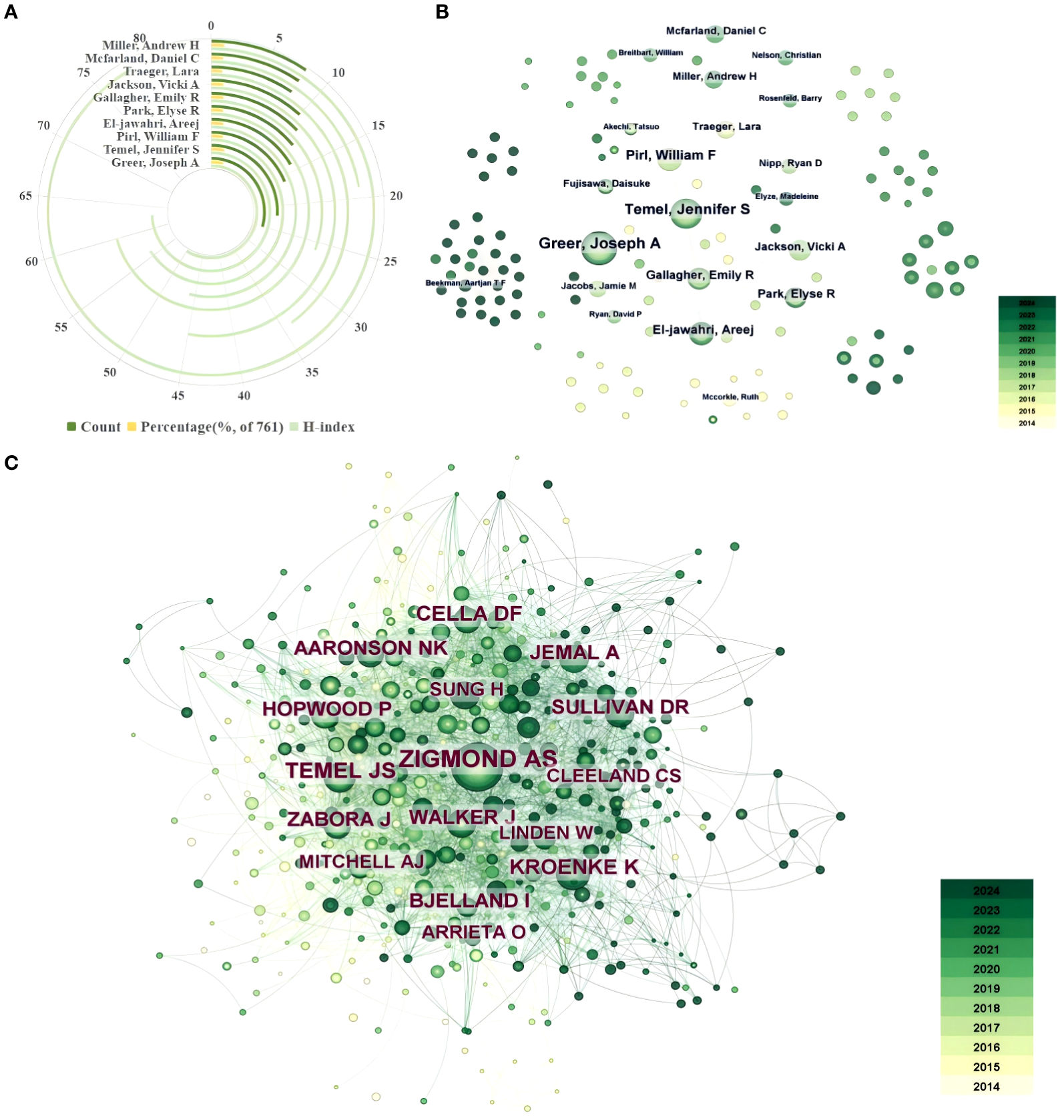 A total of 4,667 authors contributed to published articles on lung cancer and depression. Table 3 and Figure 5A show the top 10 most productive authors with the number of publications, Centrality, H-index, et al. Notably, the H-index data for these authors was obtained from the Web of Science database, with a search date of January 30, 2025. Greer, Joseph A (25, 3.29%, H-index50), Temel, Jennifer S (22, 2.89%, H-index63), and Pirl, William F (16, 2.10%, H-index56) were the most productive contributors to this field, while Miller, Andrew H had the highest H-index of 78. Notably, all these leading authors are based in the USA, reflecting the country’s significant contributions to the field. Despite China being the country with the highest number of articles, none of the top 10 published authors are affiliated with Chinese institutions. This observation implies that while there is a substantial presence of Chinese authors contributing to research on lung cancer-related depression, their individual publication output remains relatively modest, thus limiting their global influence.