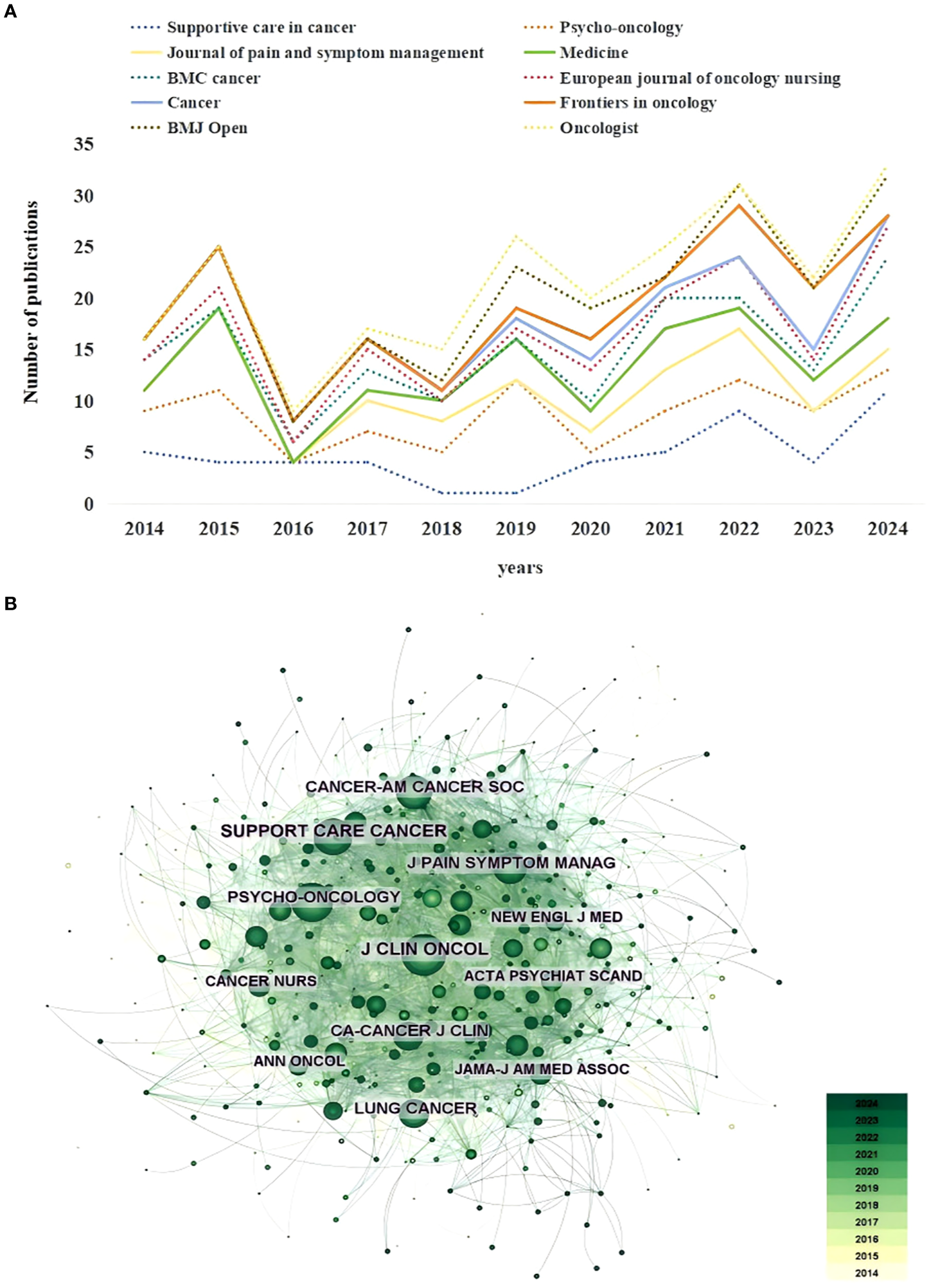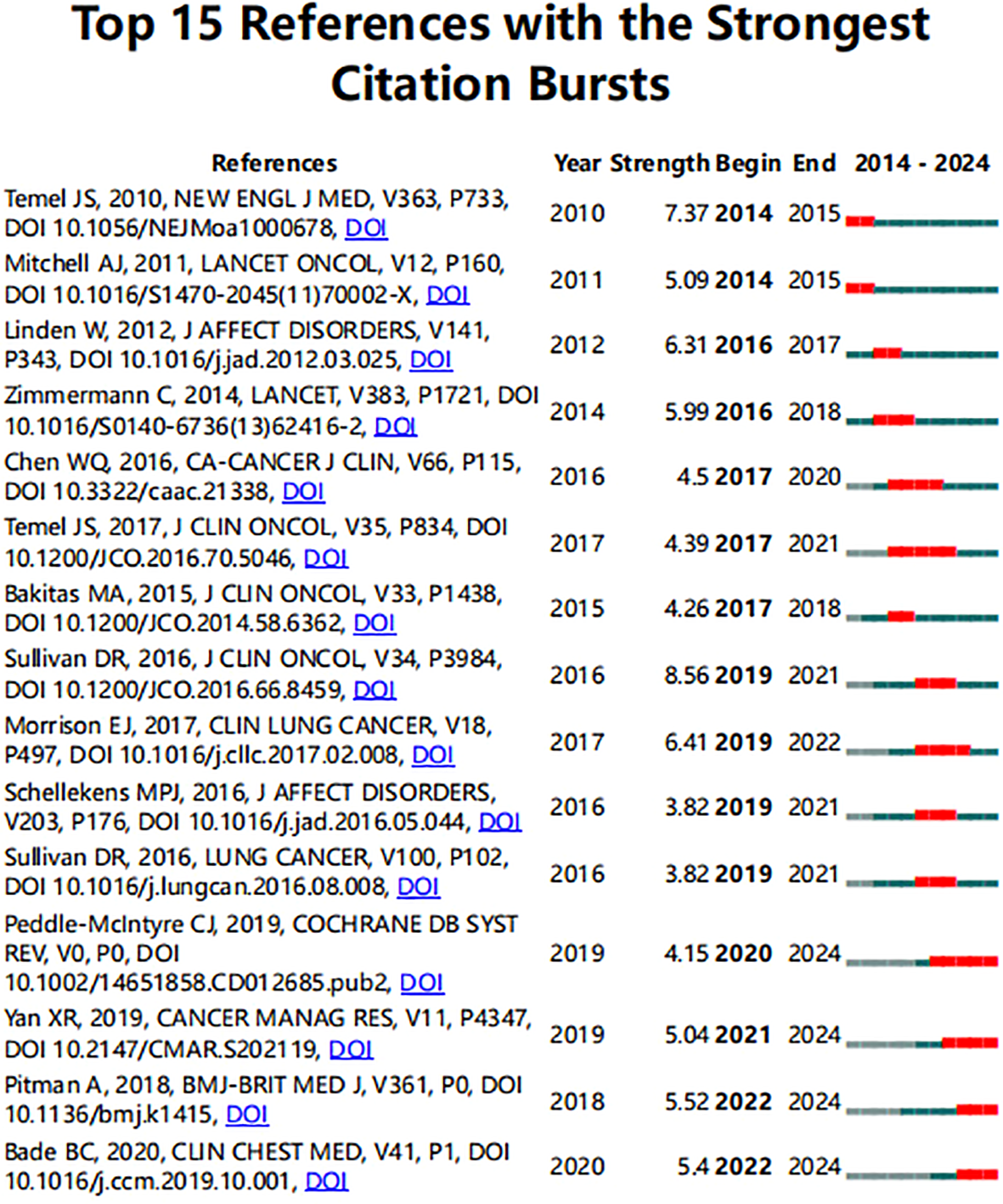 The citation count serves as a quantitative measure of the scientific impact. Table 4 presents the top 10 authors based on co-citations. Notably, the country for these authors was obtained from the Web of Science database, with a search date of January 30, 2025. A S Zigmond (185 citations) ranked first, followed by Jennifer S Temel (101 citations), and Kroenke Kurt (80 citations). The co-cited authors predominantly originate from the United States, alongside contributors from England, and the Netherlands, highlighting the global nature and collaborative spirit of the research. It is noteworthy that among the top 10 highly cited authors, only Temel Jennifer S from the United States possesses a relatively substantial publication record. Temel Jennifer S features in the list of the top 10 most prolific authors with a total of 22 publications (the second highest). This demonstrates his prolific publication record, characterized by a substantial volume of high-quality articles that have garnered widespread recognition within the academic community.