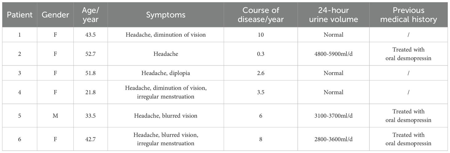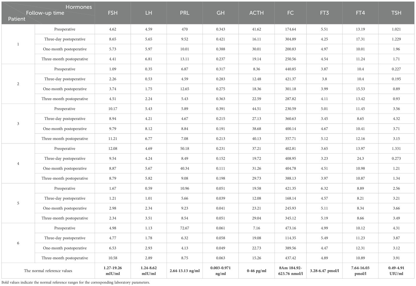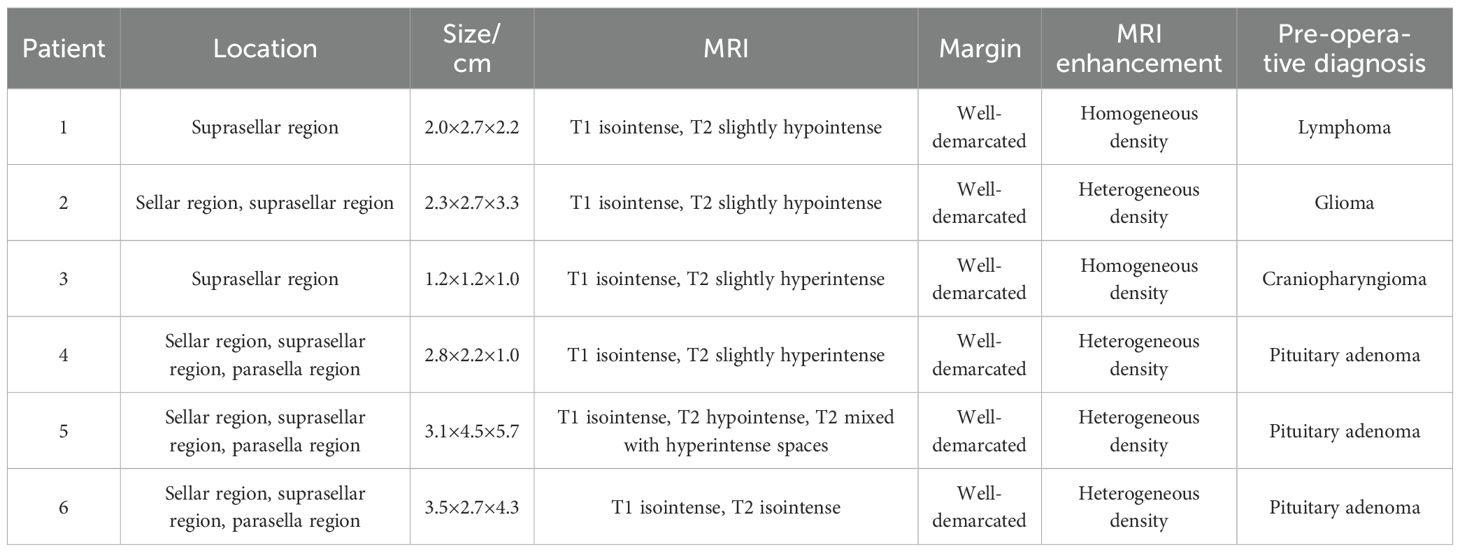 The characteristics and clinical findings of the six patients are summarized in Table 1. The median age at diagnosis was 41.0 ± 11.73 years (range: 21.8-52.7 years), with a predominance of female patients (83.3%). Among the patients, six presented with varying degrees of nonspecific headache symptoms, five exhibited visual disturbances, three experienced menstrual irregularities, and three reported polyuria. Notably, none of the patients experienced an acute onset or rapid progression of symptoms. The median duration of the disease at the time of consultation was 4.25 years (range: 0.3–10 years). Preoperative endocrine function tests were conducted on all six patients, including evaluations of pituitary hormones, plasma cortisol, plasma adrenocorticotropic hormone (ACTH), sex hormones, and thyroid function hormones, as detailed in Table 2. Preoperative laboratory tests indicated normal electrolyte levels in all patients. An increase in serum prolactin (PRL) was observed in three patients, while only one patient exhibited no discernible abnormalities in endocrine function.