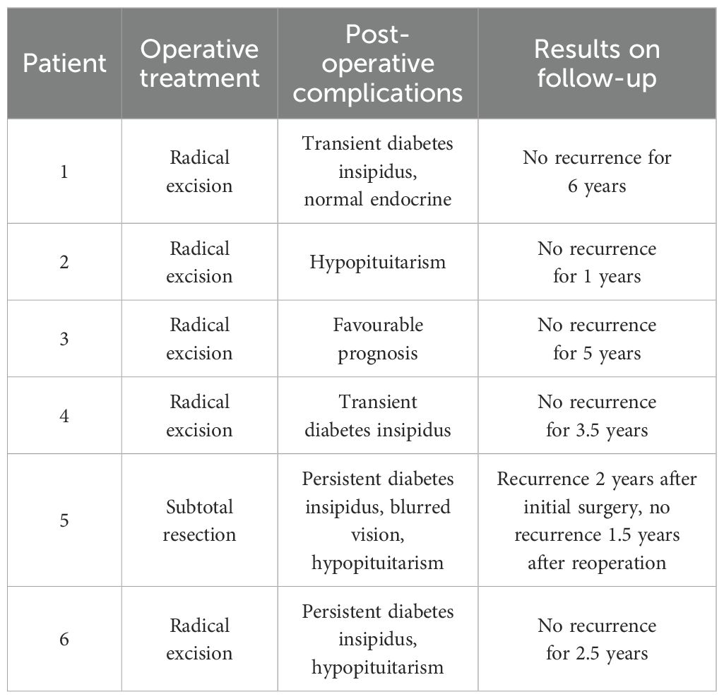 The treatment and outcomes of six patients are presented in Table 4. All patients through either a craniotomy or an endoscopic endonasal transsphenoidal approach. Intraoperatively, the tumor was observed to be closely associated with the superior pituitary stalk and exerting compression on the adjacent optic chiasm. The tumor exhibited a gray-white to tan coloration, a firm texture, and was characterized by a well-defined boundary, a capsule, and a rich vascular supply. Initial tumor removal was performed through piecewise intracapsular decompression, followed by the blunt and sharp dissection of the interface between the capsule and the arachnoid membrane, as well as the blood vessels and optic chiasm adjacent to the tumor surface. Complete tumor resection was achieved in four cases, while subtotal resection was accomplished in two cases. The primary limitation to achieving total resection in the latter cases was the tumor’s invasion into the cavernous sinus, coupled with the surgical techniques available at the time, which precluded total resection under microscopic guidance. Postoperative MRI confirmed complete resection in four cases and subtotal resection in two cases. None of the six patients received adjuvant radiotherapy or chemotherapy following surgery.