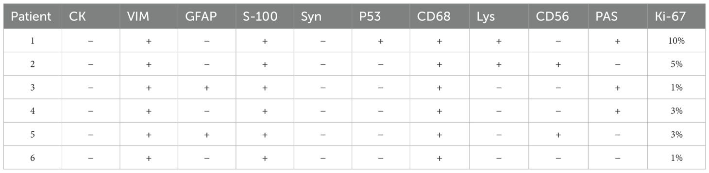 This retrospective study analyzed the clinical data of six patients who underwent surgical resection and were pathologically diagnosed with GCT of the neurohypophysis between January 2015 and January 2022. All six patients were diagnosed with GCT of the neurohypophysis following an independent review of the pathological sections conducted by two neuropathologists. To further substantiate the diagnosis, all archived pathological slides were reexamined and review meticulously reexamined by an experienced neuropathologist. The neuropathologist carefully assessed the slides, ensuring accuracy and precision, and referenced the to the World Health Organization (WHO) tissue classification guidelines to accurately identify the specific type of GCT present (5). This meticulous review and classification process ensure the reliability and validity of the diagnoses. The electronic medical record was retrieved based on the admission number, and comprehensive documentation of clinical information, surgical procedures, and imaging examinations for each patient was recorded. The image information was obtained from the picture archiving and communication system of the imaging center at our institution. All patients underwent preoperative cranial magnetic resonance imaging (MRI) scans to facilitate subsequent follow-up, with the radiological data being reassessed by two radiologists. Comprehensive clinical information, pertinent imaging data, treatment protocol, histological findings, and prognostic data of the patients were collected. The enrolled patients were followed up by telephone. According to the different stages of diseases, treatments, and complications, the content of follow-up visits varies. Follow-up assessments included evaluations of the patients’ general condition, laboratory tests (including pituitary associated hormones, and prolactin levels) and imaging studies such as brain MRI. Additionally, any instances of recurrence or metastasis were documented, noting the timing and location of recurrence as well as the current state of the disease. This study obtained approval from the hospital’s ethical review committee.