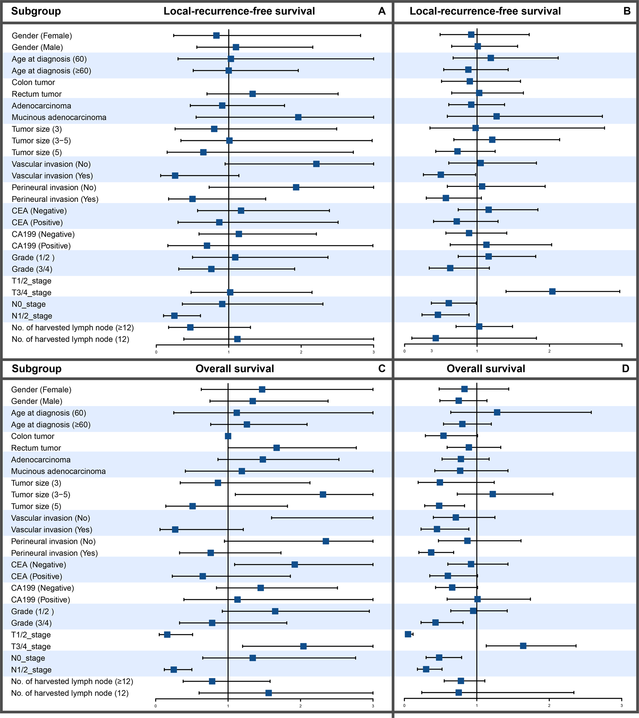 Outcomes of interest were factors influencing LRFS and OS. Starting with the first recurrence of surgical treatment, follow-ups will be conducted every 3 months for 2 years, then every 6 months, and annually after 5 years. Evaluation at follow-up included physical examination; colonoscopy; carcinoembryonic antigen (CEA) level; carbohydrate antigen 19-9 (CA199) level; chest, abdomen, and pelvis contrast-enhanced CT; and pelvic MRI or PET-CT as necessary. LRFS was defined as the time from radical surgery to the first local recurrence. OS was defined as the time from surgical treatment to death from any cause.