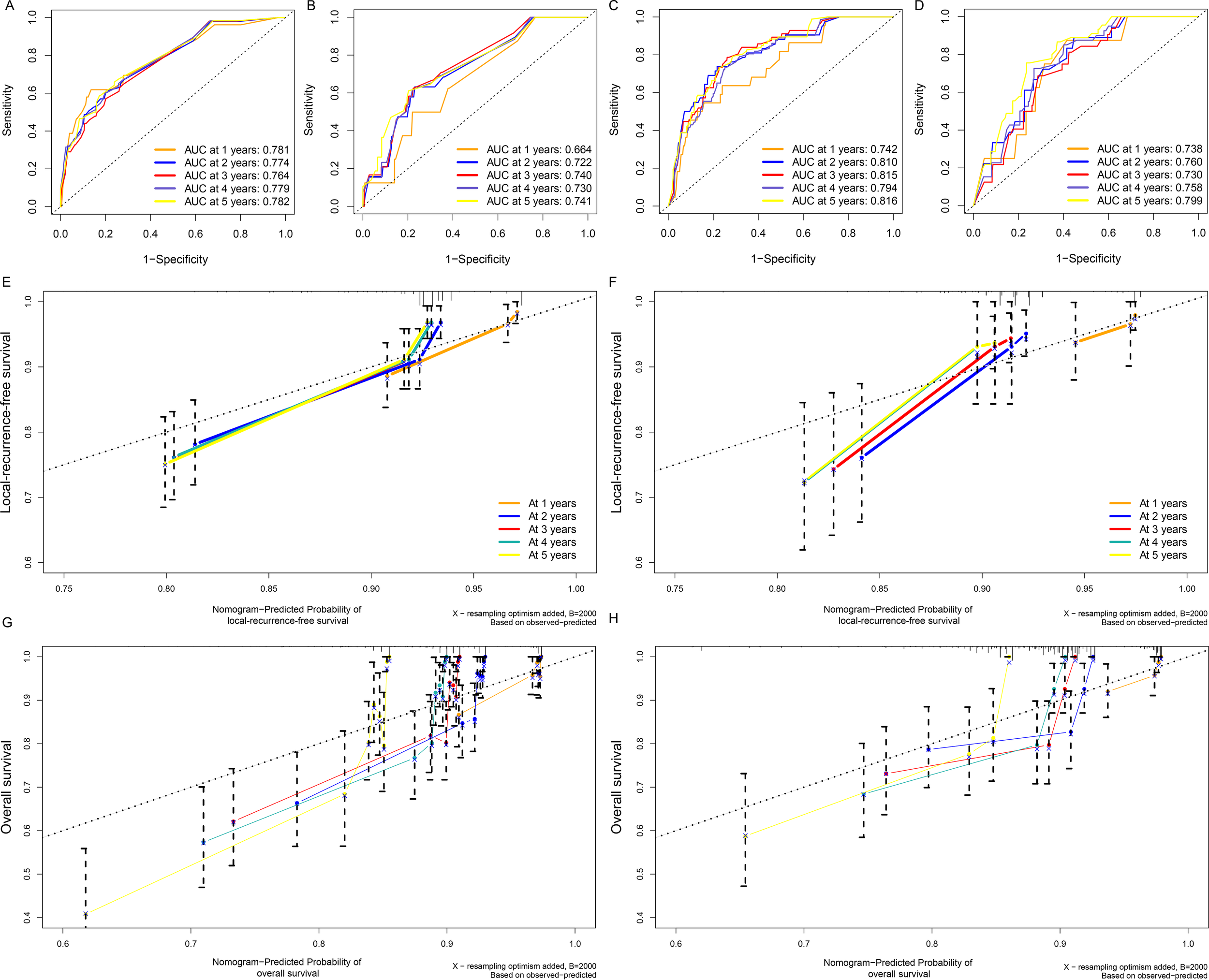 The clinical risk calculator incorporated six variables: tumor thrombus, perineural invasion, tumor grade, pathology T-stage, pathology N-stage, and whether more than 12 lymph nodes were harvested. Our clinical risk calculator provided good discrimination, with AUC values of local recurrence-free survival (LRFS) (0.764) and overall survival (OS) (0.815) in the training cohort and LRFS (0.740) and OS (0.730) in the test cohort. Calibration plots illustrated excellent agreement between the clinical risk calculator predictions and actual observations for 3- and 5-year LRFS and OS. Recurrence risk-stratified analysis showed that low-risk patients were more likely to undergo salvage radical surgery when recurrent disease existed.