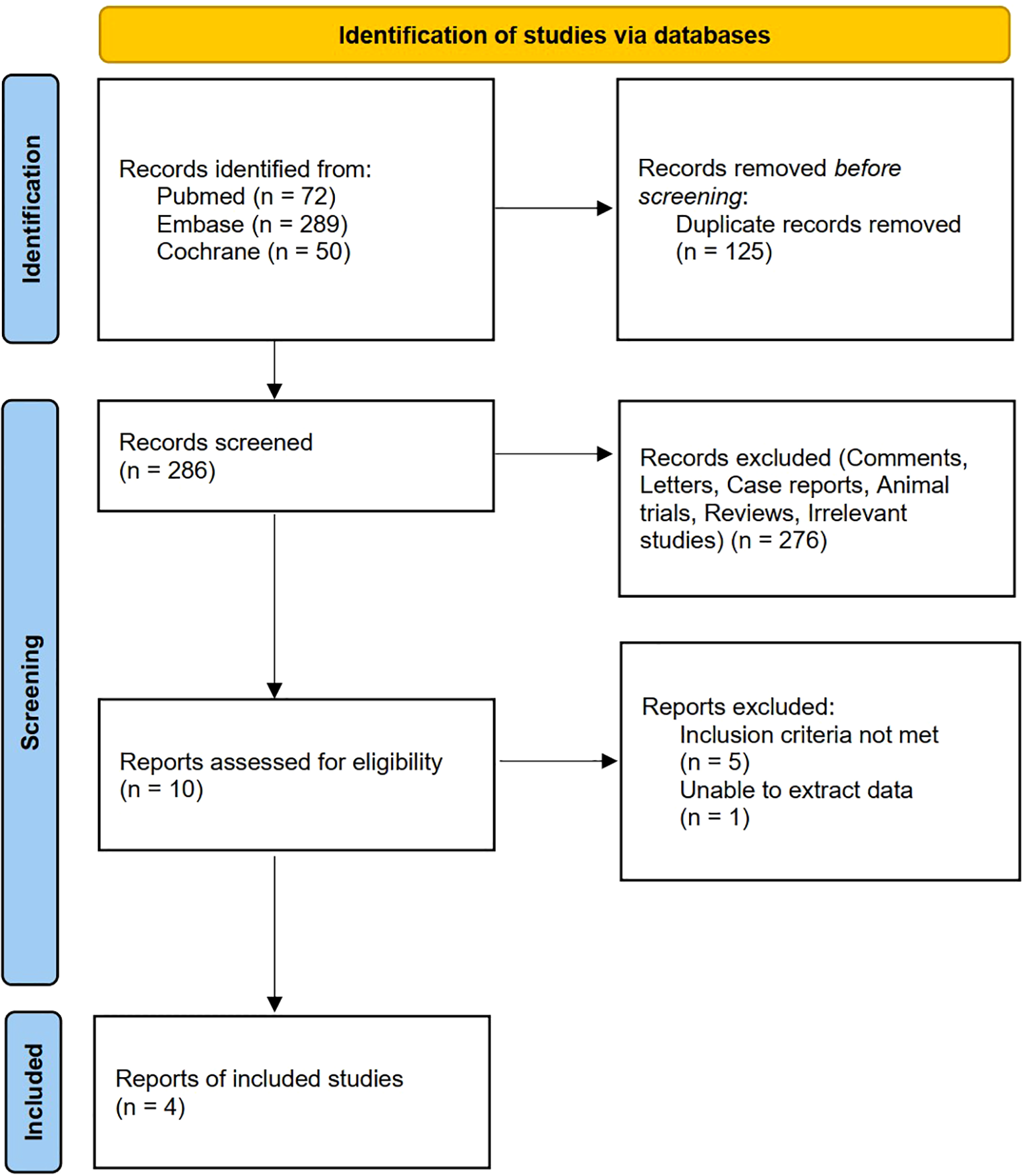 Of the initial 411 records retrieved from the electronic databases, 125 were discarded because of duplications. Among the remaining 286 records, meticulous assessment of their titles and abstracts led to the exclusion of 276 ineligible records. Subsequently, a rigorous full-text review of the remaining eight RCTs eliminated another six, narrowing down to four RCTs that fulfilled the eligibility criteria for study inclusion (Figure 1). In total, four RCTs (8, 9, 11, 12) involving 278 patients conducted in China and USA, published in 2014 and 2023 were included in the analysis.