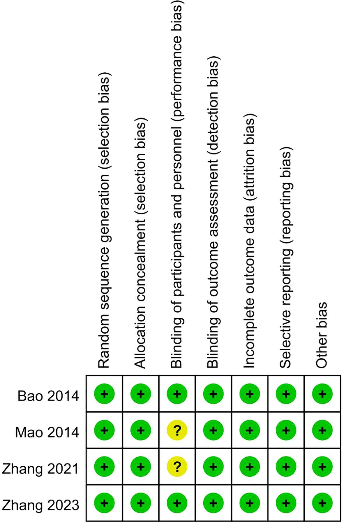 Adhering to the Cochrane Systematic Review Handbook 5.1 and its recommended risk-of-bias assessment methodology, the quality of the included studies was thoroughly examined. This evaluation encompassed scrutiny of various factors, including random-sequence generation, allocation concealment, blinding of participants and personnel, blinding of outcome assessment, incomplete outcome data, selective reporting, and other biased. The results of the risk-of-bias assessment were categorized into “low risk,” “high risk,” and “unclear.” This quality evaluation was conducted independently by two researchers, and any conflicts were resolved through mediation by the corresponding author.