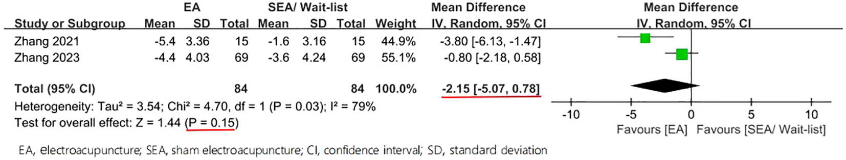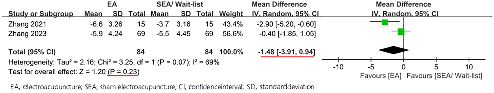 A meticulous meta-analysis revealed no statistically significant reduction in the insomnia severity index in the EA group compared with the sham EA or wait-list group, neither at 3 weeks nor at 6 weeks with MDs of −2.15 (95% CI −5.07 to 0.78, P = 0.15, I2 = 79%) and −1.48 (95% CI −3.91 to 0.94, P= 0.23, I2 = 69%), respectively (Figures 4, 5).