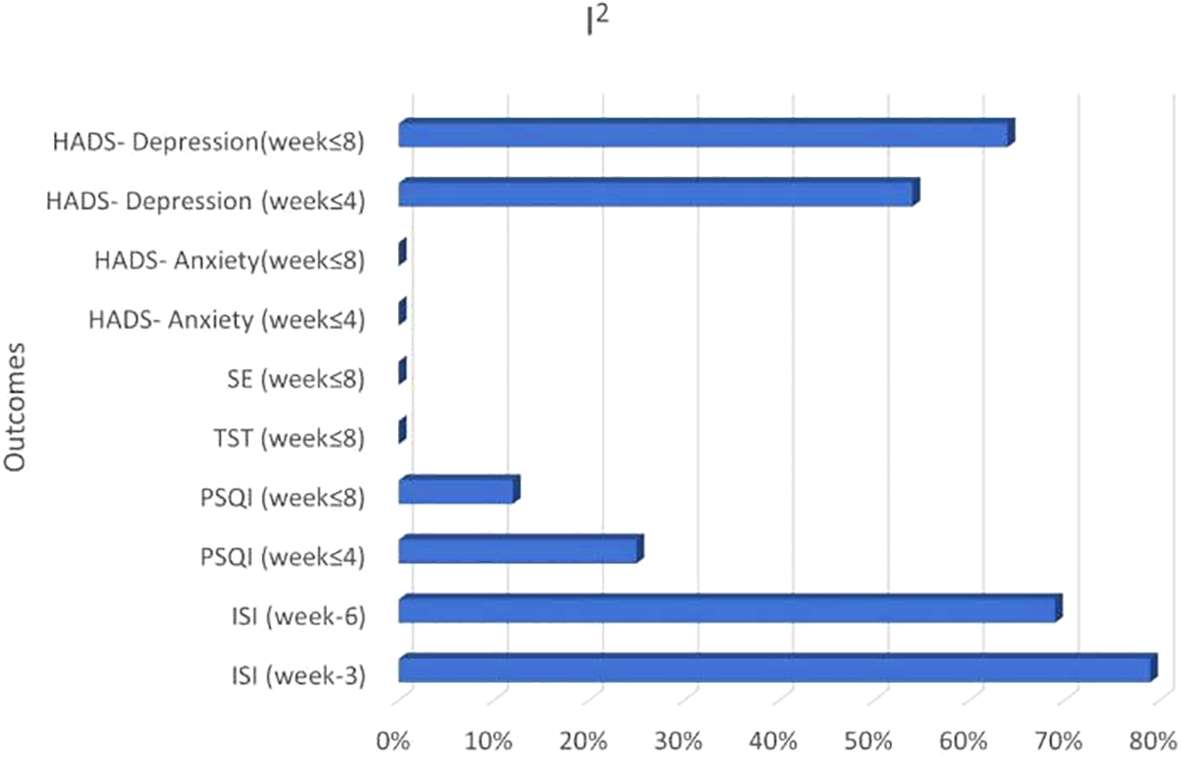 Consistent with the guidelines stipulated in the Cochrane Handbook for Systematic Reviews of Interventions, the analysis of publication bias was deemed unnecessary because none of the study groups comprised more than 10 studies. Visualizing the heterogeneity (I ²) of all outcomes reveals that the I ² of the primary outcome measure ISI was higher than that of other outcomes (Figure 8). A sensitivity analysis was conducted to evaluate the stability of the findings by systematically excluding individual studies one at a time from the meta-analysis. However, sensitivity analysis could not be performed for the ISI outcomes in either the Week 3 or Week 6 groups due to the inclusion of only two studies in these analyses. The analysis demonstrated variability in the pooled effect estimates for PSQI outcomes across both the group of ≤4 weeks and group of ≤8 weeks, with the studies by Mao (2014) and Zhang (2021) identified as primary contributors to this heterogeneity. A comprehensive comparative examination is warranted to clarify methodological or clinical discrepancies between these two studies and the remaining included studies, as well as to elucidate the underlying factors driving their disproportionate influence on the results. Detailed outcomes of the sensitivity analyses are summarized in Tables 3 and 4.